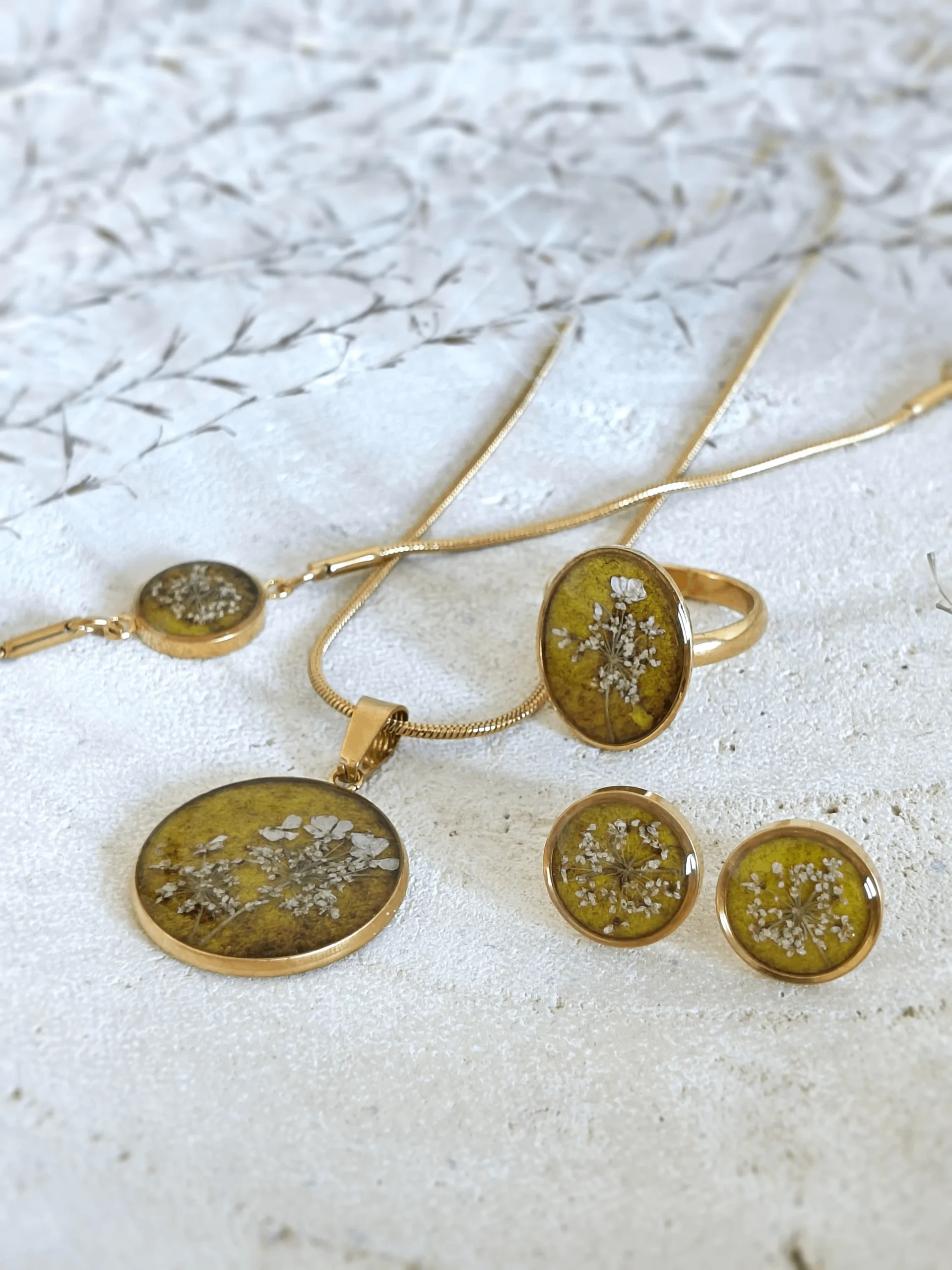 Bazy naszyjnika, kolczyków, bransoletki i pierścionka, wykonane z trwałej i hipoalergicznej stali chirurgicznej, gwarantują komfort noszenia i stanowią idealne tło dla naturalnego piękna zatopionych kwiatów. Każdy element tego kompletu jest unikalny i niepowtarzalny, dzięki ręcznemu malowaniu i naturalnej formie kwiatów.