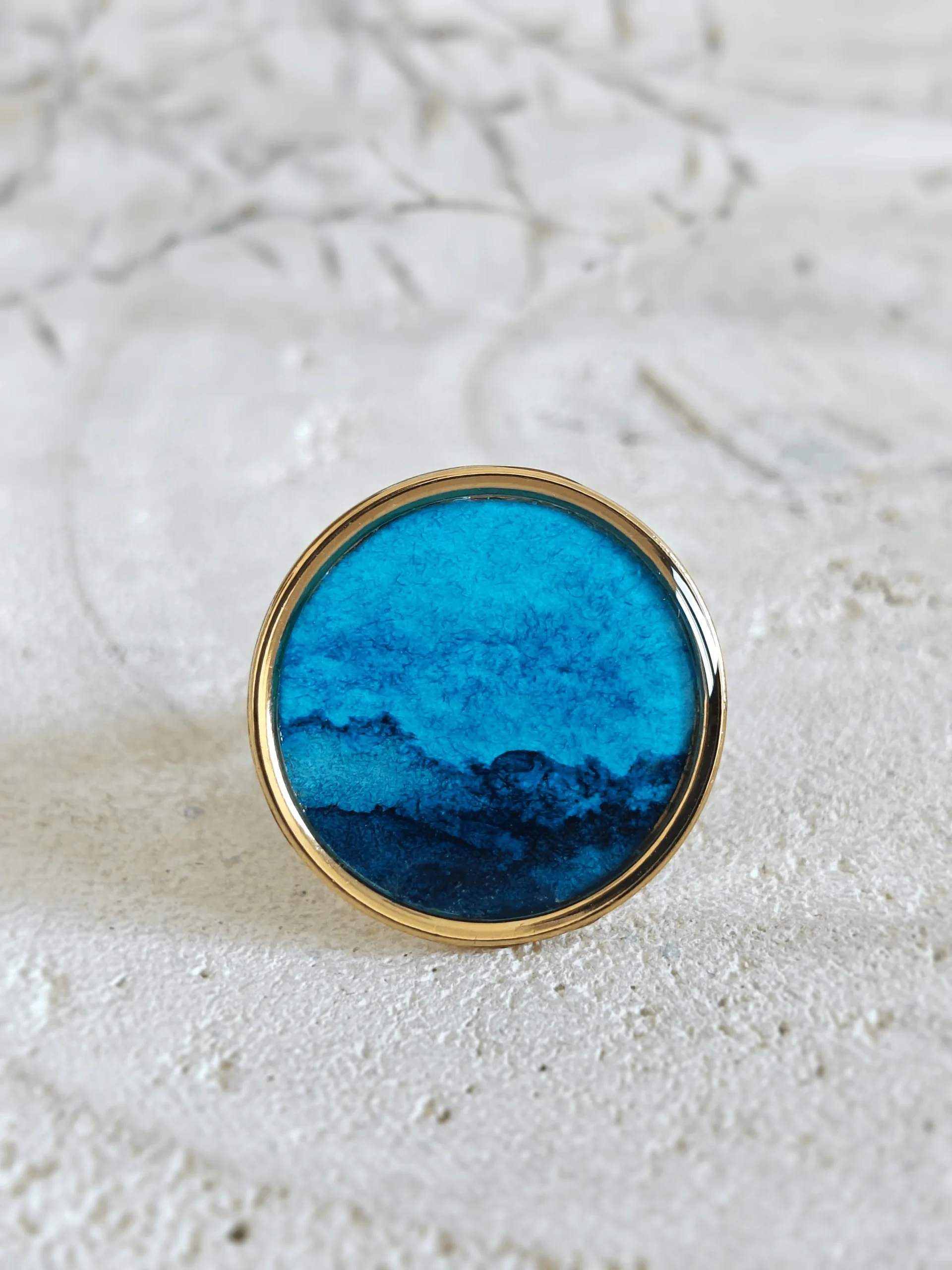 Komplet z kolekcji Fontis nawiązuje swoją nazwą do słowa źródło. Połączenie odcieni turkusu, seledynu z granatem kojarzy się z pięknymi wodami, morzami, termami, źródełkami. Głębia tego maleńkiego malunku ma odzwierciedlać głębię wody. W komplecie znajdziesz duży pierścień, kolczyki wkrętki, naszyjnik (łańcuszek z zawieszką) i bransoletke na łańcuszku. Bizuteria hand made, którą właśnie oglądasz została namalowana akwarelami w 100% ręcznie. Mały obraz jest zabezpieczony i odporna na wszelkie czynniki zewnętrzne – w tej biżuterii możesz nawet się w niej kąpać.