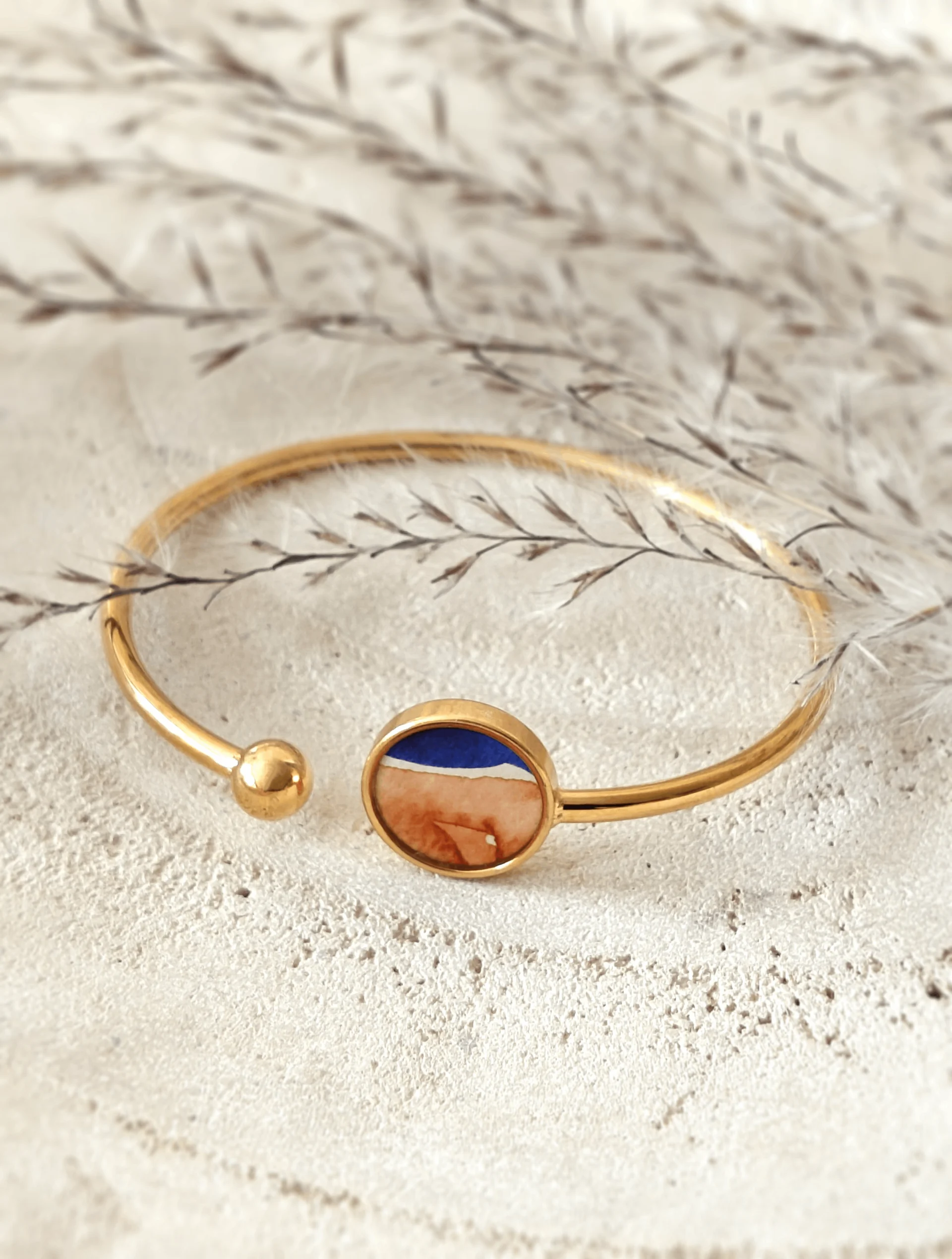 Odkryj wyjątkową, ręcznie robioną bransoletkę z żywicy, która zachwyca harmonią odcieni indygo i brązu. Ta artystyczna bransoletka to połączenie naturalnego piękna i precyzyjnego rękodzieła. Centralnym elementem bransoletki jest żywiczny element ozdobny, ręcznie malowany akwarelami najwyższej jakości. Do malowania użyto tradycyjnych japońskich farb akwarelowych, wytwarzanych ręcznie z naturalnych pigmentów. Dzięki temu kolory są niezwykle intensywne, trwałe i pełne głębi.