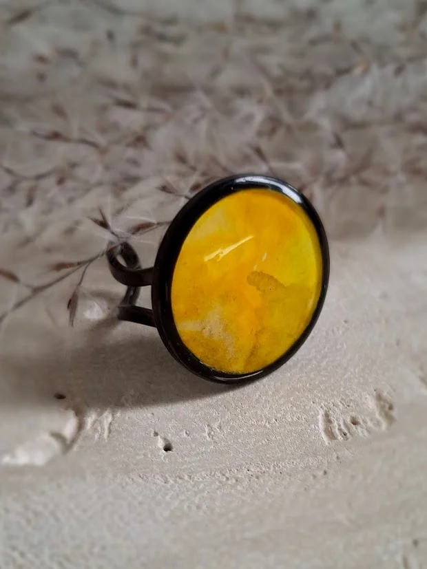 Czarny pierścionek z dużym oczkiem żółta akwarela