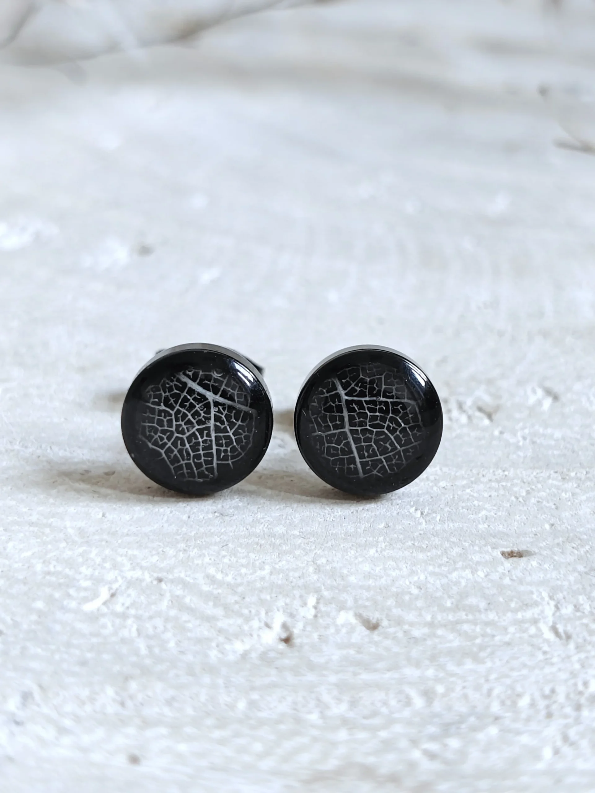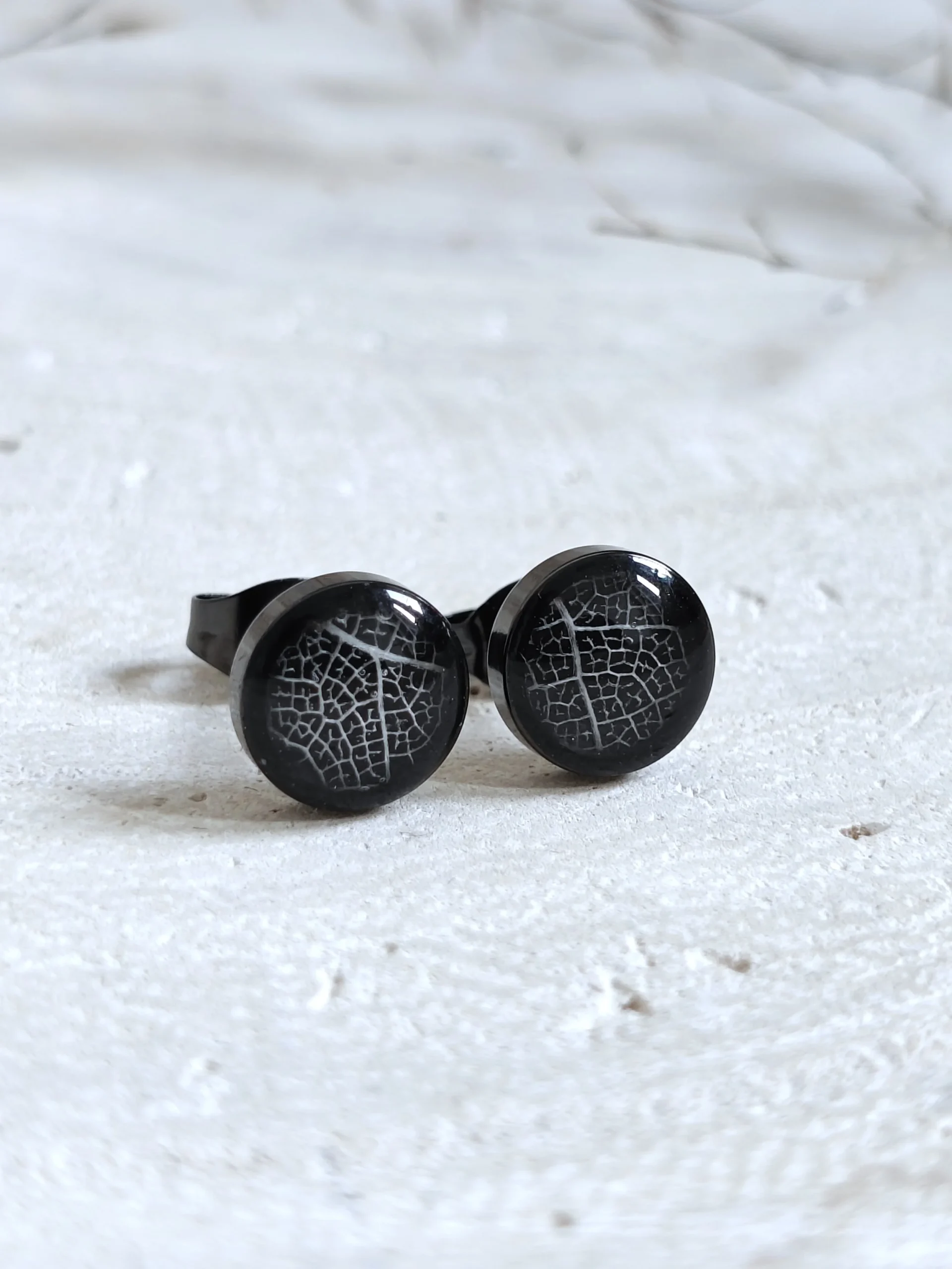 Czarne kolczyki sztyfty ze strukturą liścia magnolii zatopioną w żywicy. Dostępna jest tylko 1 sztuka, jednak nie jest ona samotna – z tej kolekcji dostępne od ręki mamy również pierścionek, bransoletkę, spinki do mankietów, kolczyki wiszące, naszyjnik z minerałami i naszyjnik na łańcuszku.
