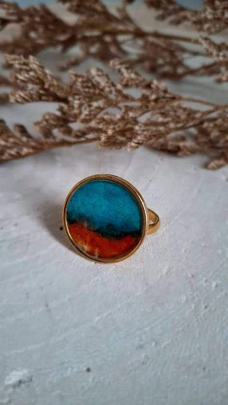 Odkryj niepowtarzalny zestaw biżuterii z motywami malowanymi akwarelą. Dwa odcienie zieleni, umieszczone w złotej oprawie, tworzą geometryczną kompozycje. Komplet zawiera kolczyki sztyfty (8 mm) i regulowany pierścionek. Ten absolutnie unikatowy komplet sprzedawany jest wyłącznie w całości. Dostępna jest tylko jedna sztuka – jeśli Ci się spodobała, nie przegap okazji!