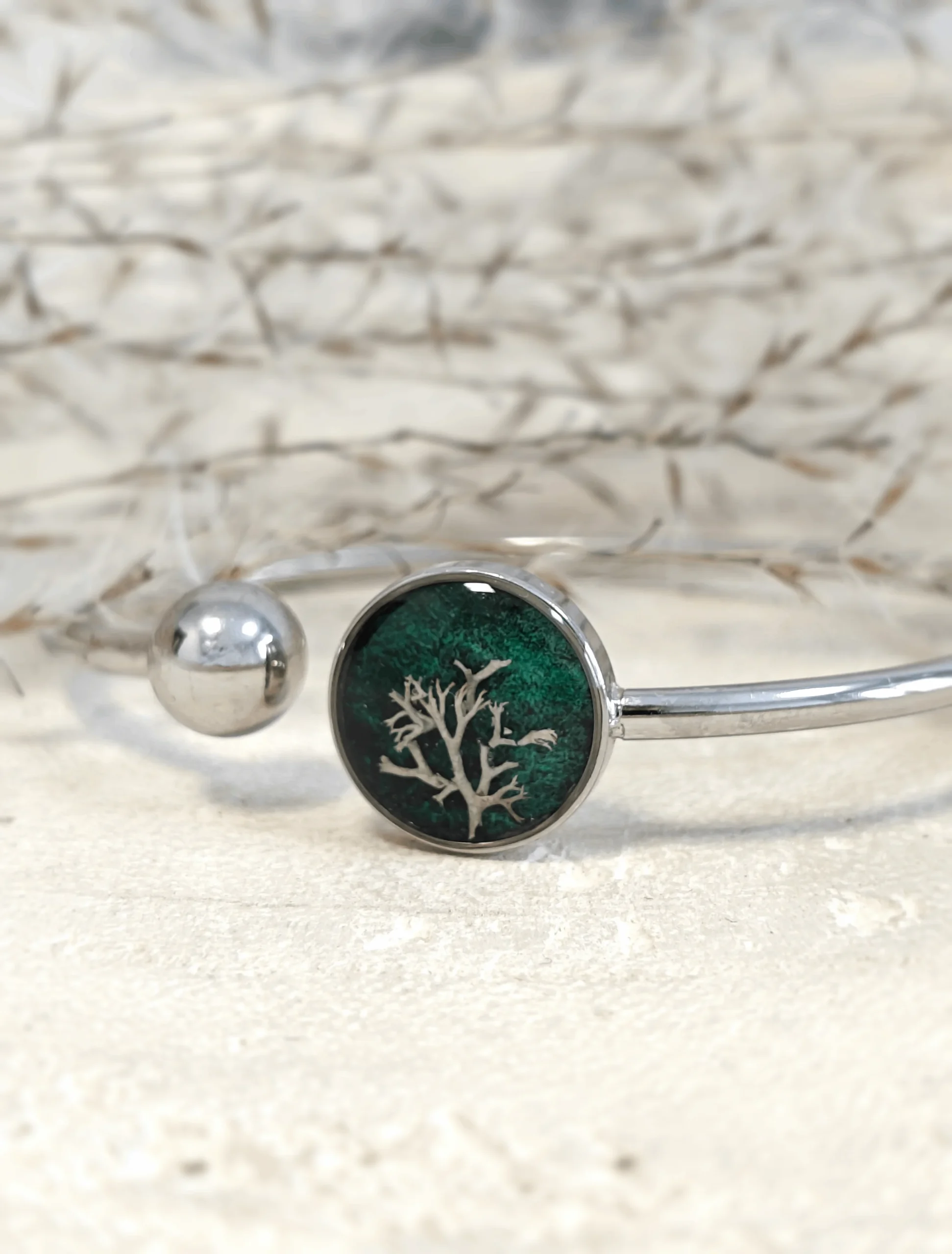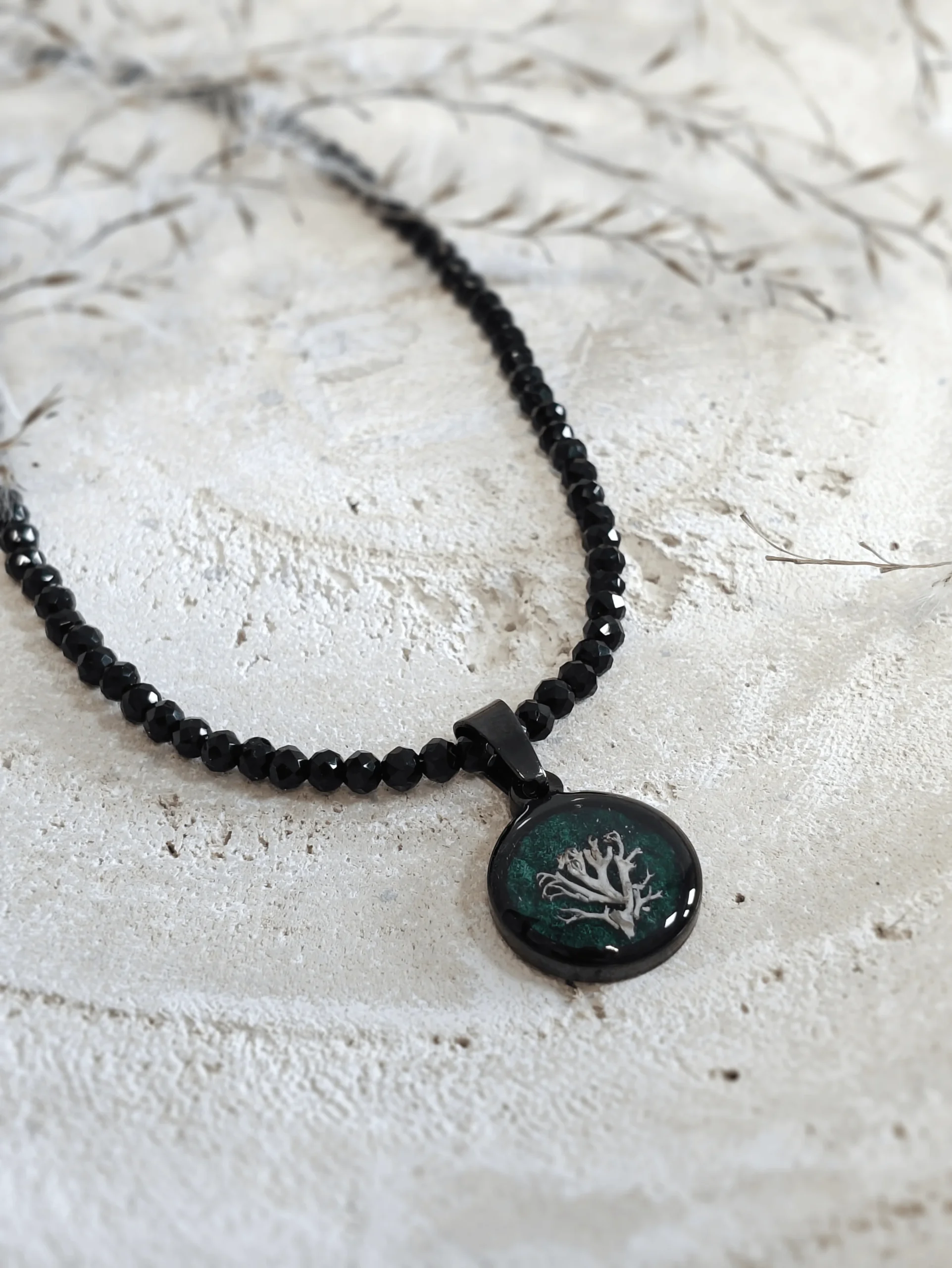 Zwolnij bieg i poczuj kojącą moc natury, którą zamknęliśmy w formie biżuterii. Ten unikatowy komplet to hołd dla runa leśnego, stworzony z myślą o kobietach, które pragną nosić cząstkę lasu zawsze przy sobie. Głównym bohaterem kolekcji jest autentyczny chrobotek reniferowy, starannie wyselekcjonowany i zabezpieczony w przezroczystej żywicy. Jego miękka, organiczna struktura została wyeksponowana na głębokim, ciemnozielonym tle, które stworzyliśmy przy użyciu tradycyjnych japońskich akwareli. Naturalne pigmenty farb nadają oczkom biżuterii niezwykłą głębię – zależnie od kąta padania światła, zieleń mieni się odcieniem mchu, szmaragdu i tajemniczego, gęstego lasu. Połączenie surowej przyrody z elegancją akwareli sprawia, że komplet pasuje zarówno do lnianej sukienki, jak i wieczorowej stylizacji.