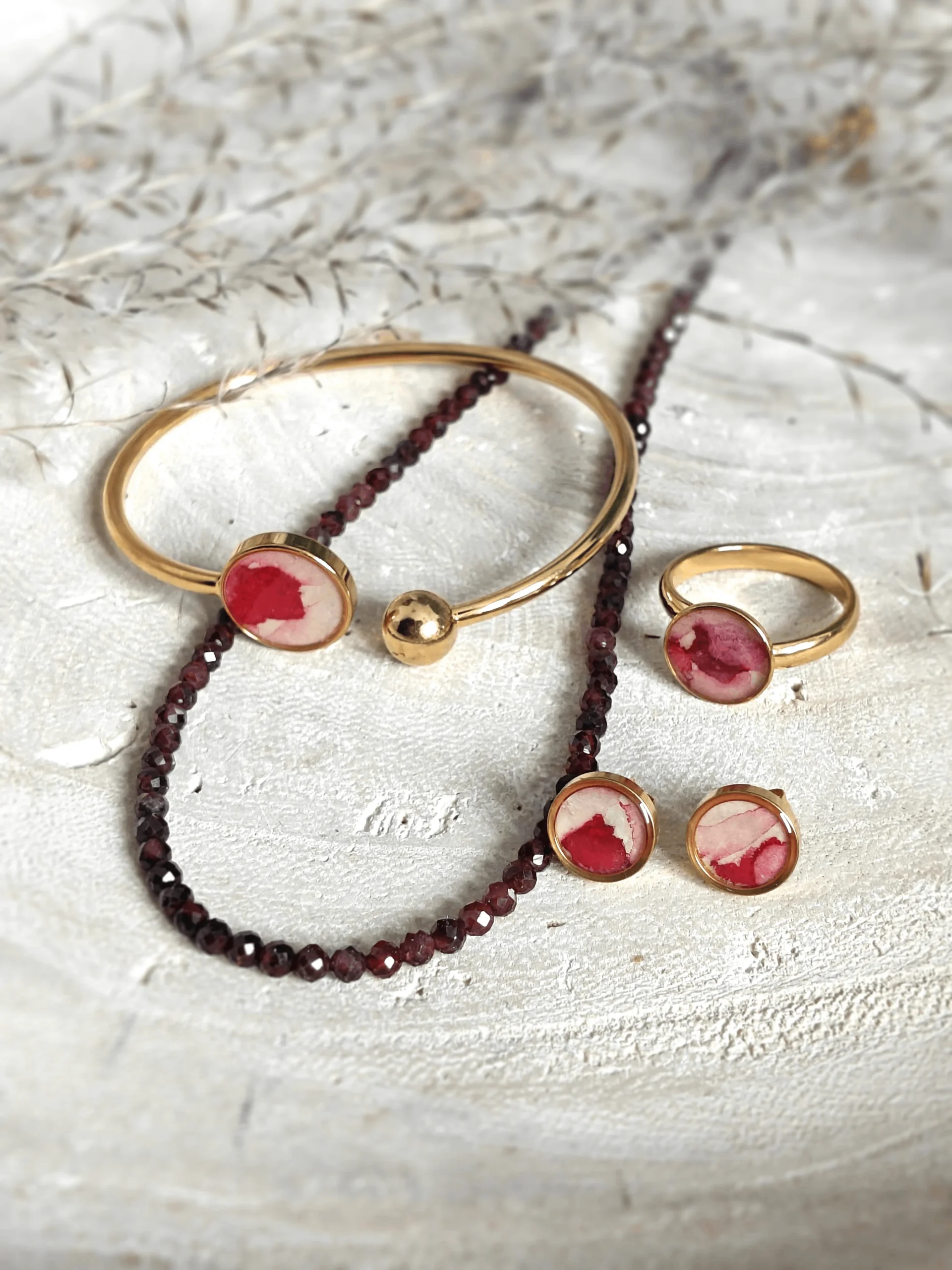 Komplet Biżuterii z kolekcji Rubus, granat i ręcznie malowane kolczyki