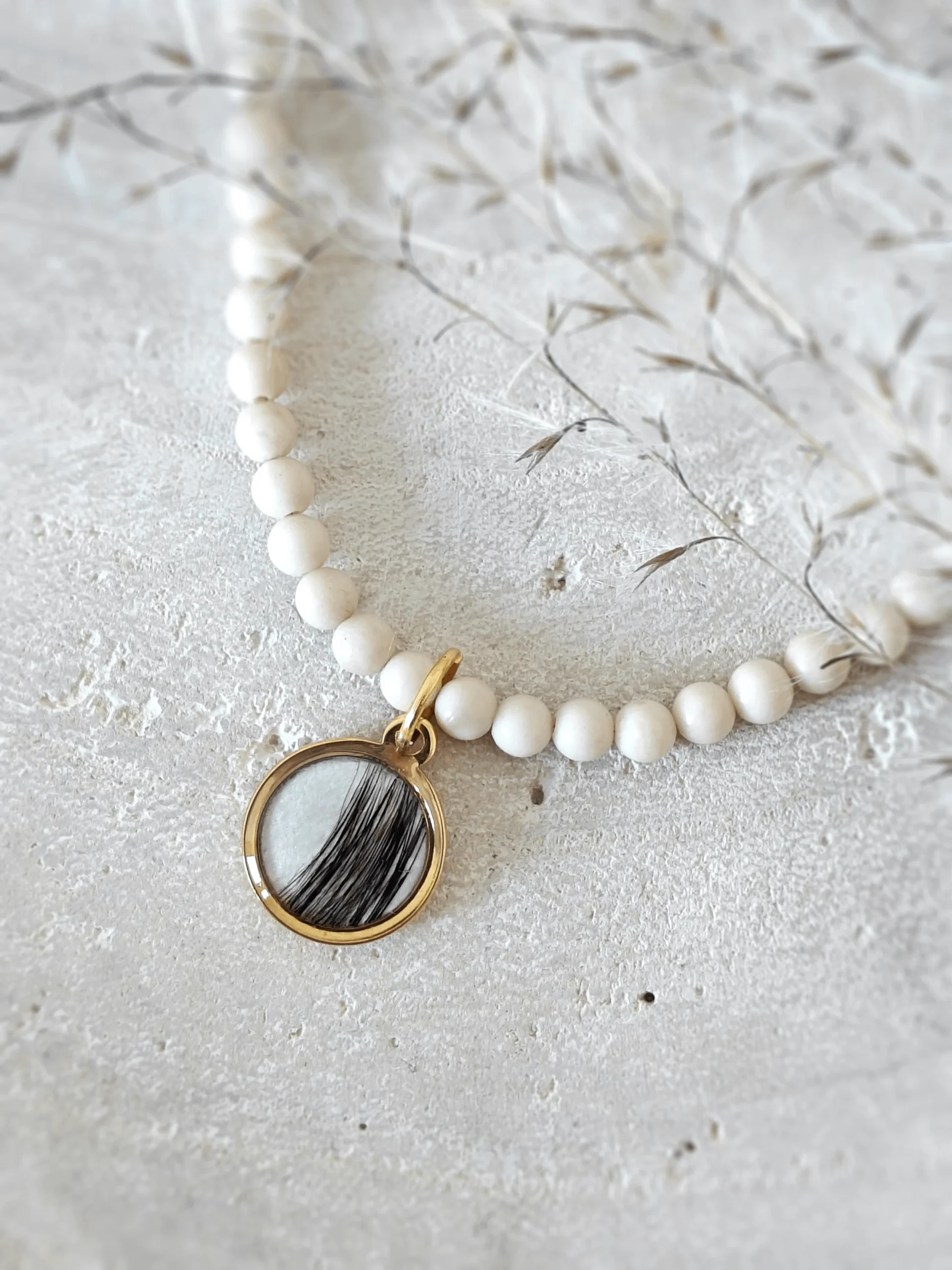 Nasz jubiler przygotowuje tło w wybranym przez Ciebie kolorze akwareli, a następnie precyzyjnie układa pasmo sierści. Całość zamykamy pod krystaliczną taflą żywicy jubilerskiej, która chroni pamiątkę przed słońcem i czasem.