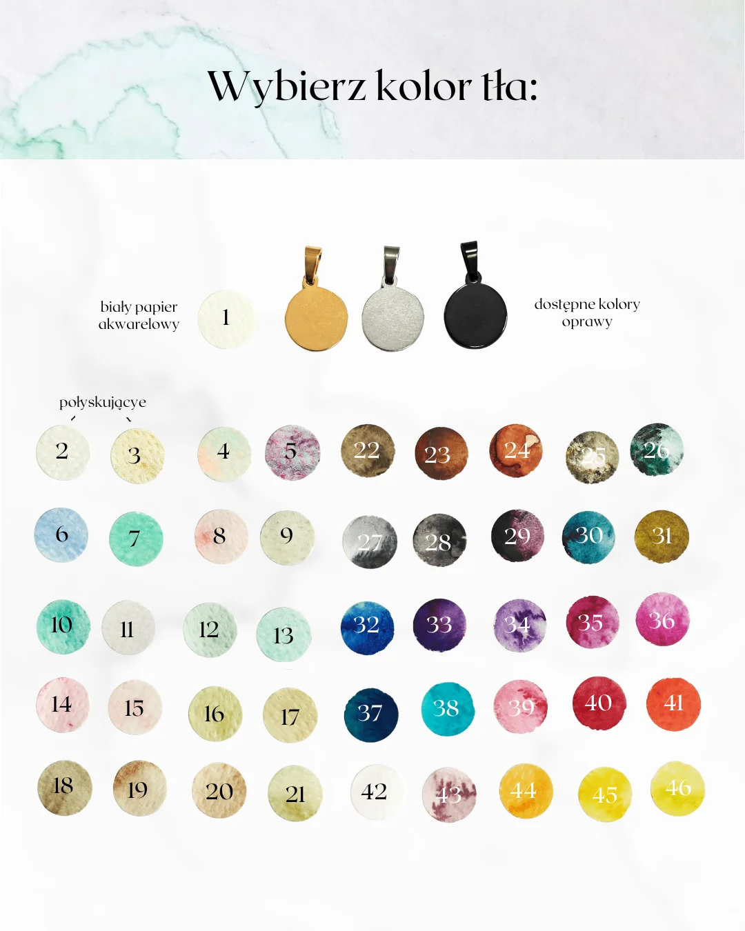 Wybierz bazę biżuterii (kolor srebrny, złoty lub czarny), a następnie dopasuj tło z ręcznie malowanej akwareli. Wybierz numer – kolor akwareli z próbnika powyżej, który najlepiej podkreśli umaszczenie Twojego pupila. Przy wyborze naszyjnika z minerałów – odezwiemy się mailowo w celu doboru kamieni.