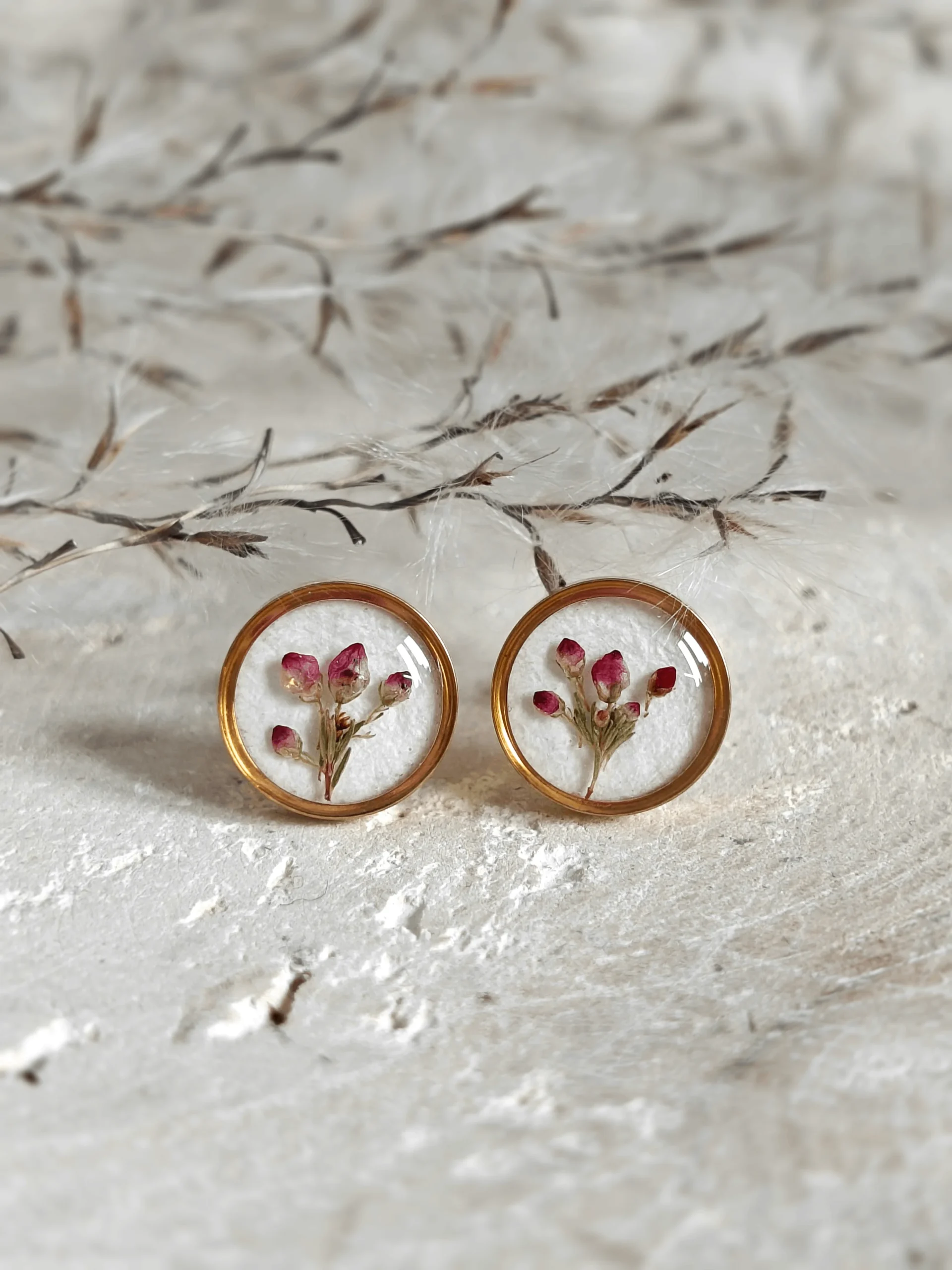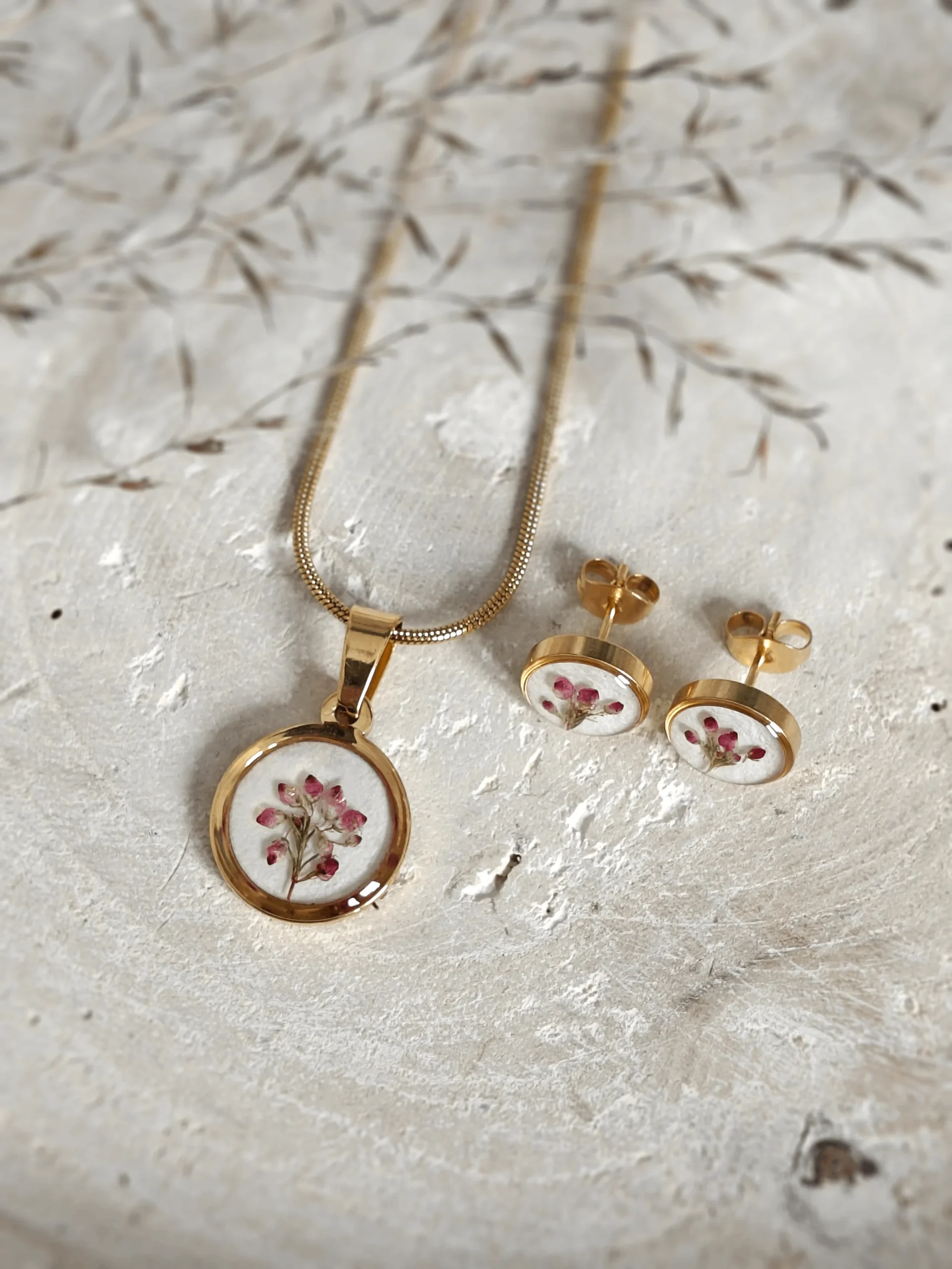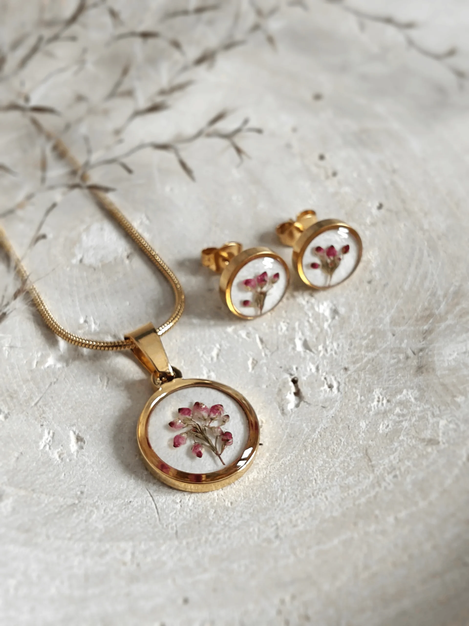Biżuteria z wrzoścem: Twoja osobista cząstka natury. Unikatowy komplet wykonany z prawdziwych kwiatów i transparentnej żywicy. Ponieważ natura nie zna powtarzalności, każdy element różni się niuansami – co czyni tę ręcznie robioną kolekcję w pełni unikatową. Piękno tkwi w detalu.