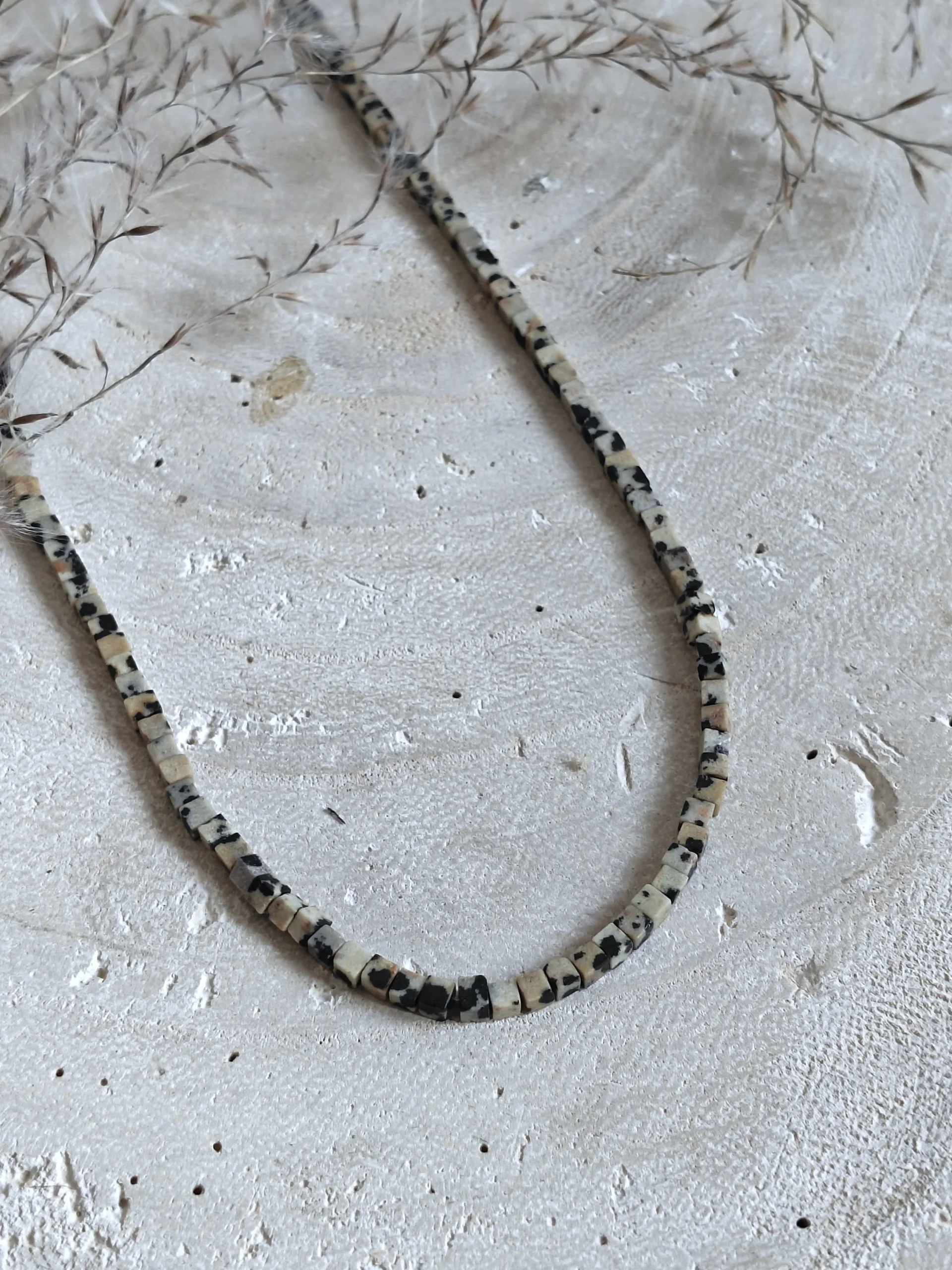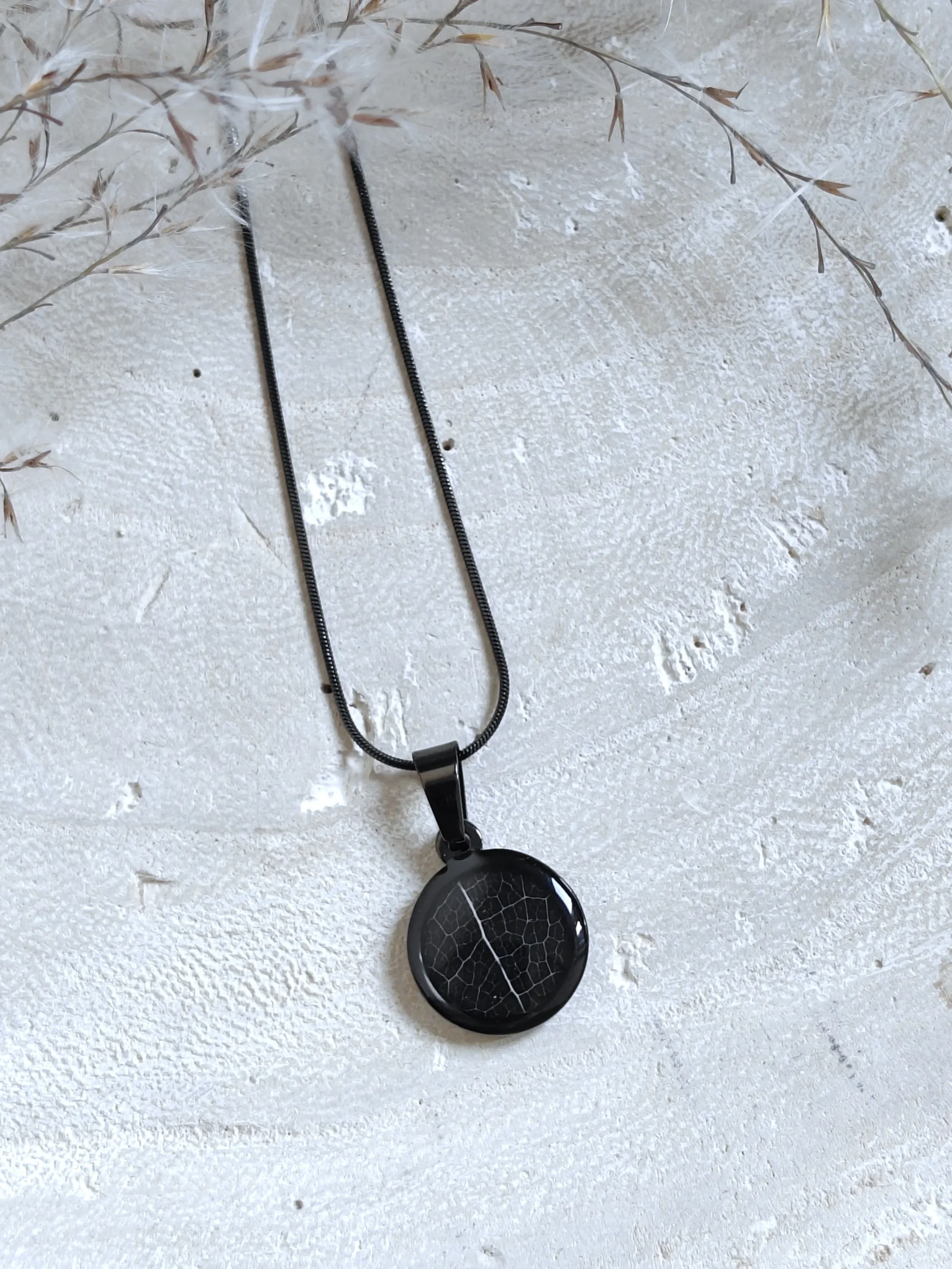 Naszyjnik z oczkiem o średnicy 12mm z zatopioną w żywicy strukturą liścia magnolii. Dostępna jest tylko 1 sztuka, jednak nie jest ona samotna – z tej kolekcji dostępne od ręki mamy również pierścionek, bransoletkę, spinki do mankietów, kolczyki sztyfty, kolczyki wiszące i naszyjnik z minerałami.