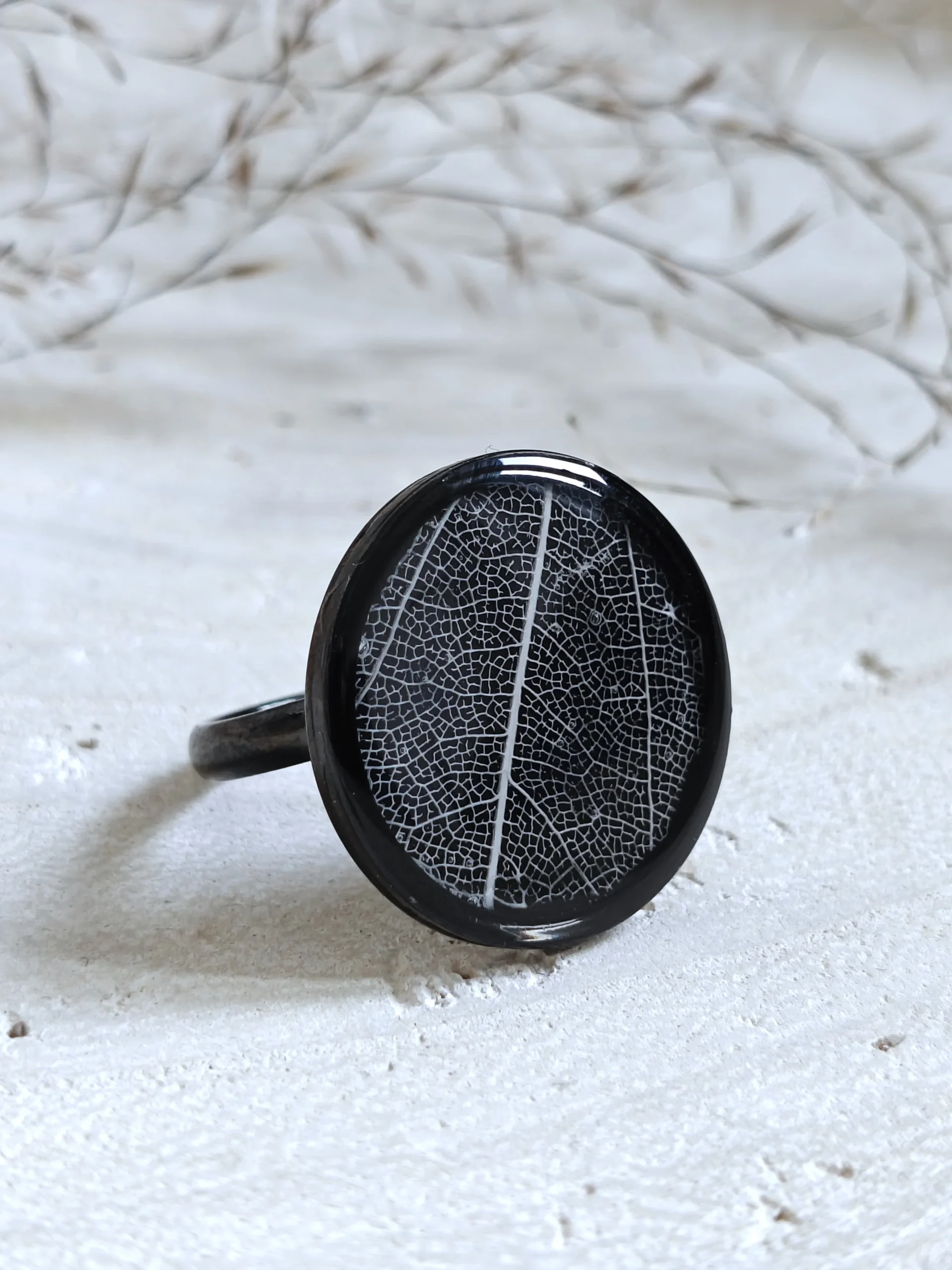 Regulowany czarny pierścionek ze strukturą liścia magnolii, z oczkiem o średnicy 20mm. Dostępna jest tylko 1 sztuka, jednak nie jest ona samotna – z tej kolekcji dostępne od ręki mamy również bransoletkę, spinki do mankietów, kolczyki sztyfty, kolczyki wiszące, naszyjnik z minerałami i naszyjnik na łańcuszku.