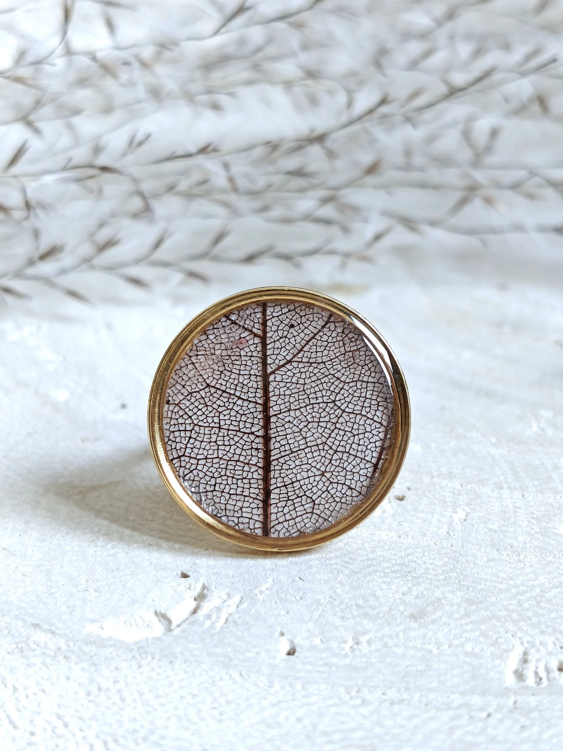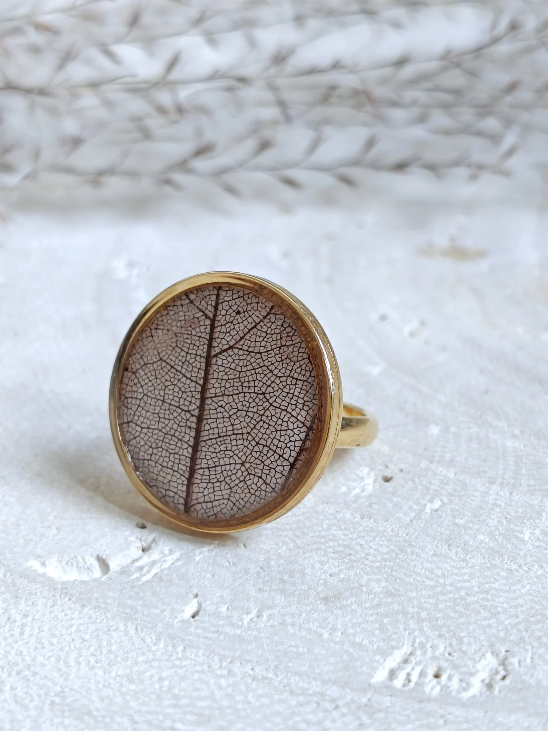 Regulowany pierścionek ze strukturą liścia, z oczkiem o średnicy 20mm. Dostępna jest tylko 1 sztuka, jednak nie jest ona samotna – z tej kolekcji dostępne od ręki mamy również kolczyki sztyfty, kolczyki wiszące i naszyjnik.
