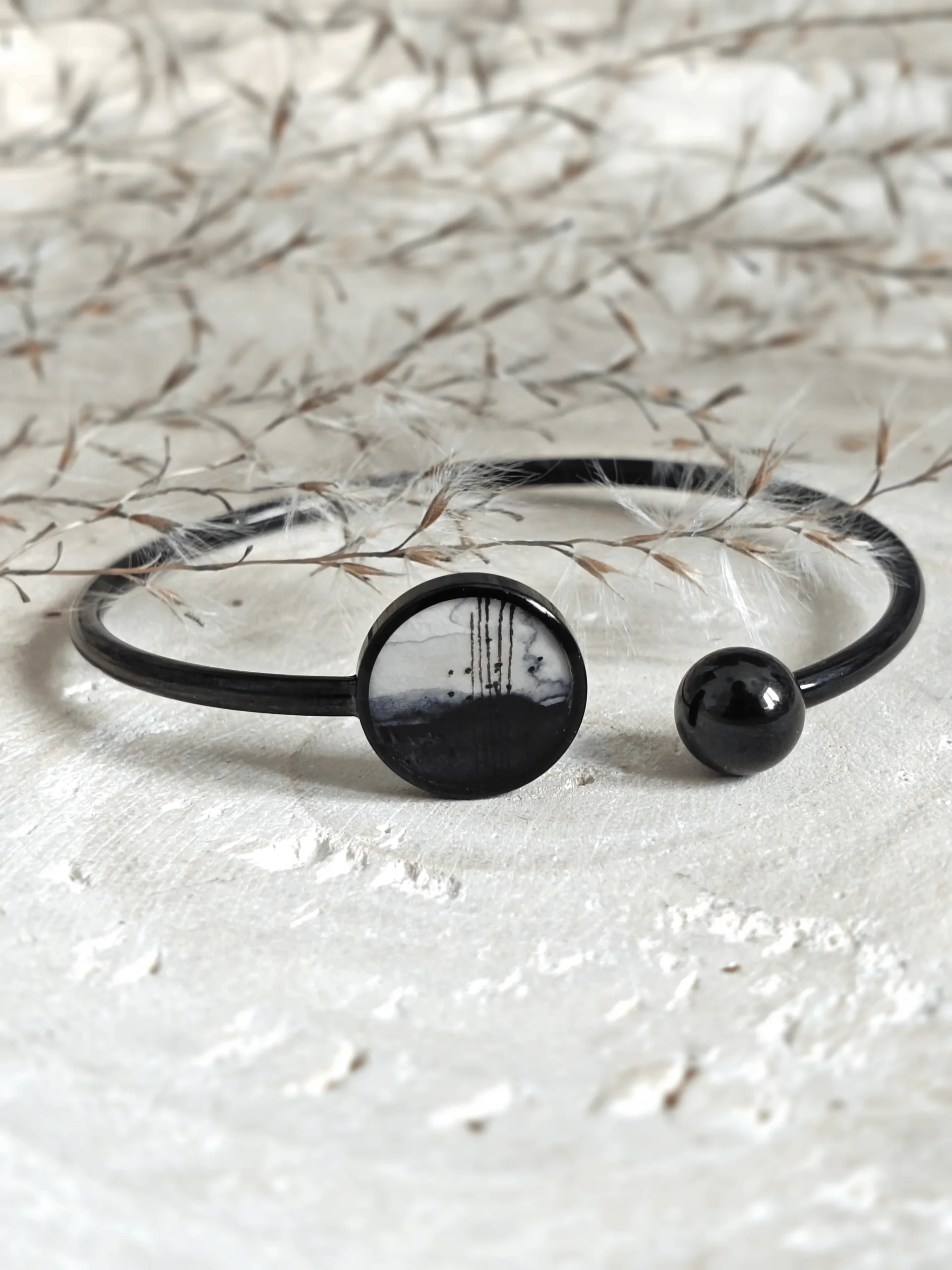 Ta czarna bransoletka to połączenie nowoczesnego designu z rękodzielniczym kunsztem, idealnie wpisujące się w aktualne trendy biżuteryjne. Jej wyjątkowość podkreśla ręcznie malowany, czarno-biały wzór akwarelowy, czyniąc każdą bransoletkę absolutnie unikatową. Do stworzenia tego subtelnego elementu ozdobnego bransoletki użyto najwyższej jakości japońskich farb akwarelowych, bazujących na naturalnych pigmentach, gwarantujących trwałość i intensywność barw. Czarna baza bransoletki stanowi idealne tło dla kontrastowego, czarno-białego wzoru, podkreślając jego delikatne niuanse. Uniwersalna kolorystyka sprawia, że bransoletka doskonale komponuje się z różnymi stylizacjami, od casualowych po eleganckie.