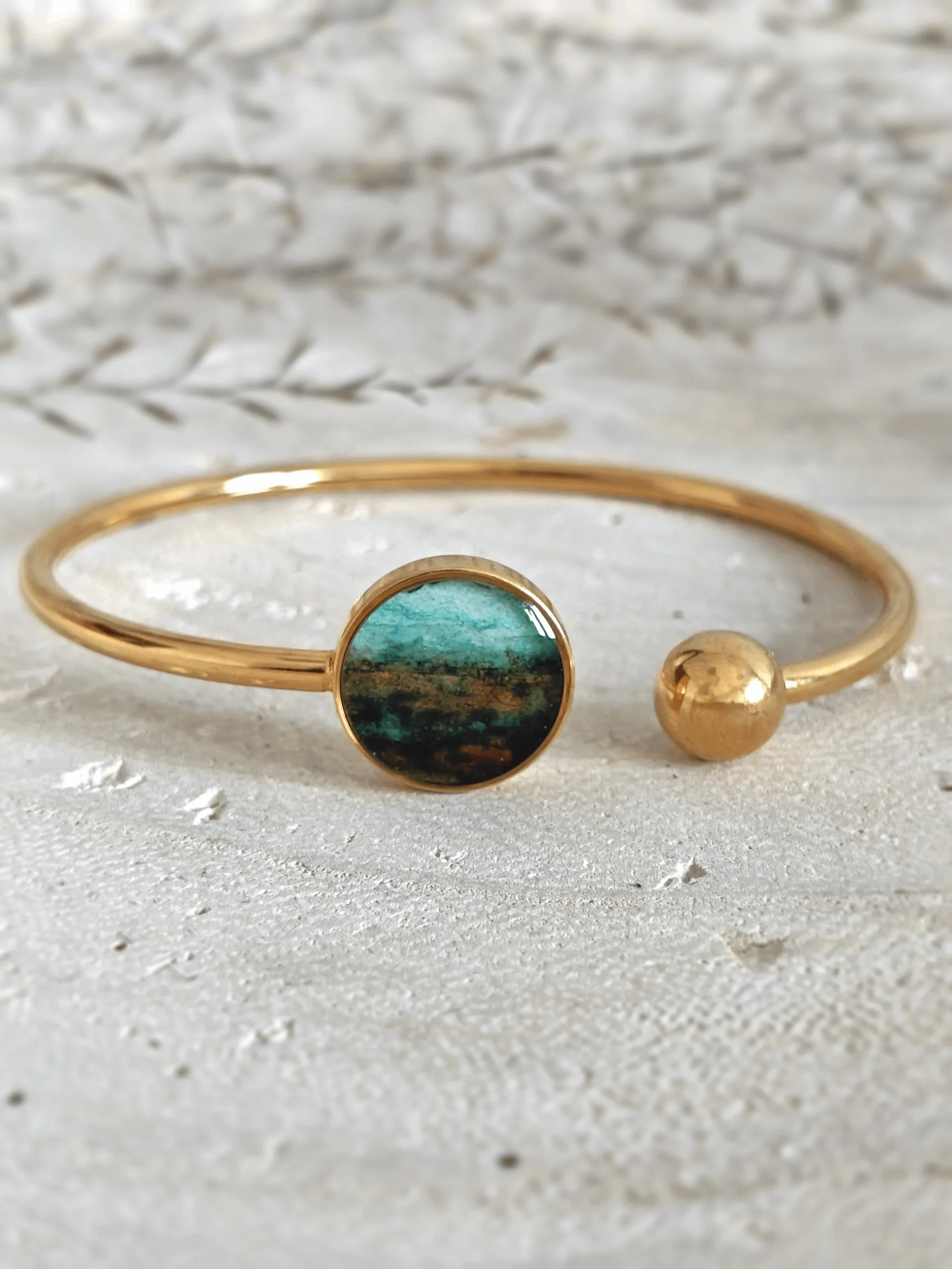 Dodatkowym elementem ozdobnym bransoletki jest ręcznie malowany element akwarelowy. Do jej wykonania użyto najwyższej jakości japońskich farb, wytwarzanych tradycyjnymi metodami z naturalnych pigmentów. Dzięki temu kolory są intensywne, trwałe i pełne głębi. Ręczne malowanie sprawia, że każda bransoletka jest unikatowa i niepowtarzalna, co dodaje jej wyjątkowego charakteru. Połączenie turkusu afrykańskiego, z jego ochronnymi i wzmacniającymi właściwościami, z filozofią Ubuntu, podkreślającą jedność i współistnienie, oraz ręcznie malowaną akwarelą, tworzy wyjątkową biżuterię z duszą. Ta bransoletka będzie idealnym prezentem dla osób ceniących sobie harmonię, duchowość i piękno natury.