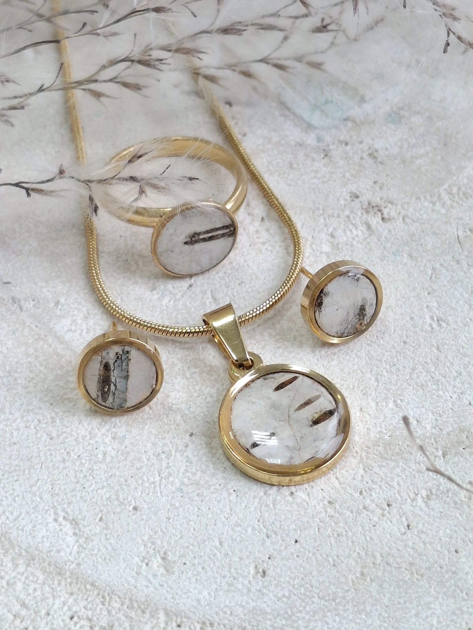 Komplet zawiera naszyjnik z oczkiem 12mm, kolczyki 8mm, regulowany pierścionek z oczkiem 10mm.