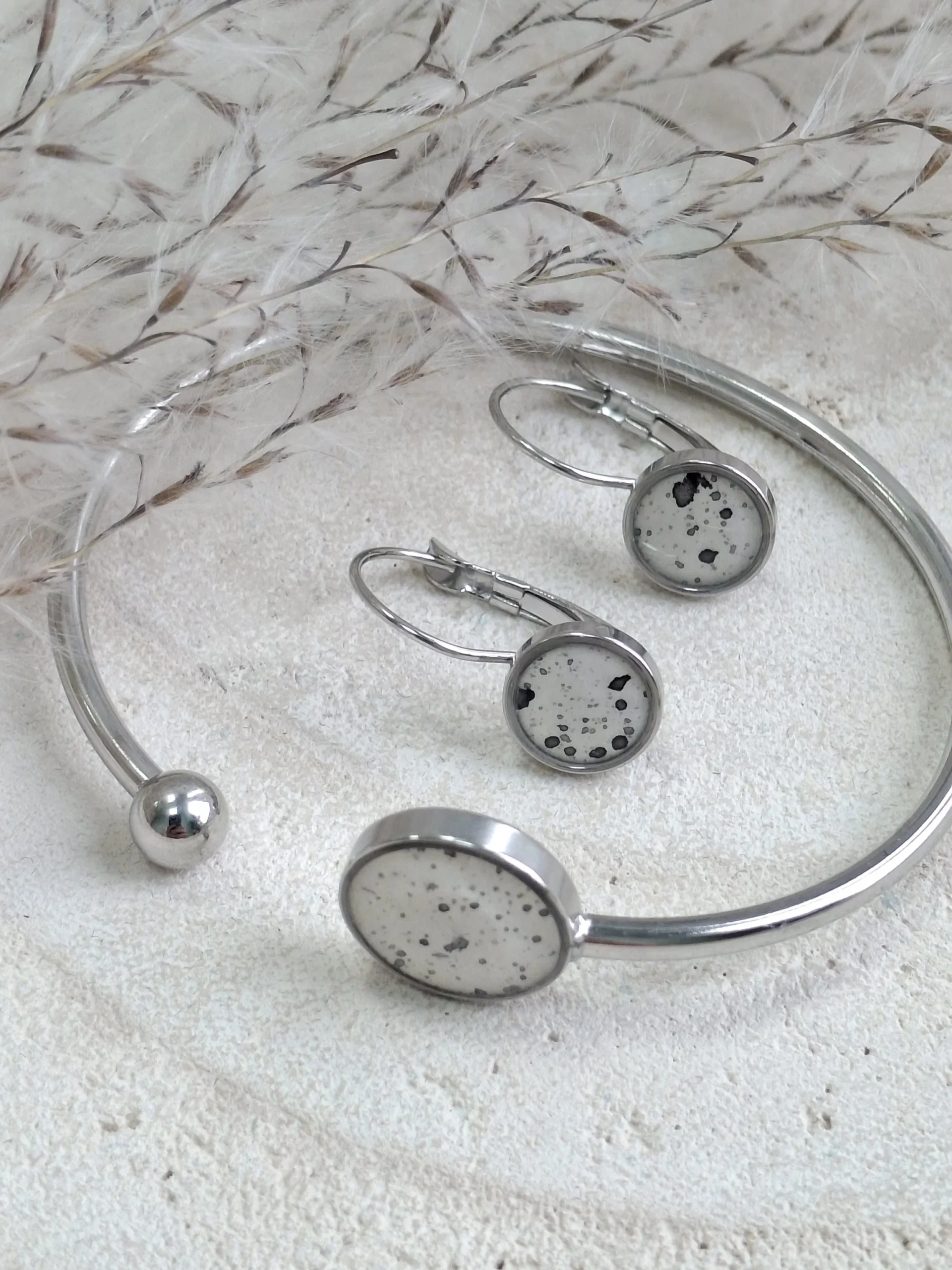 Komplet zawiera: kolczyki wiszące, regulowana bransoletka z oczkiem 12mm.