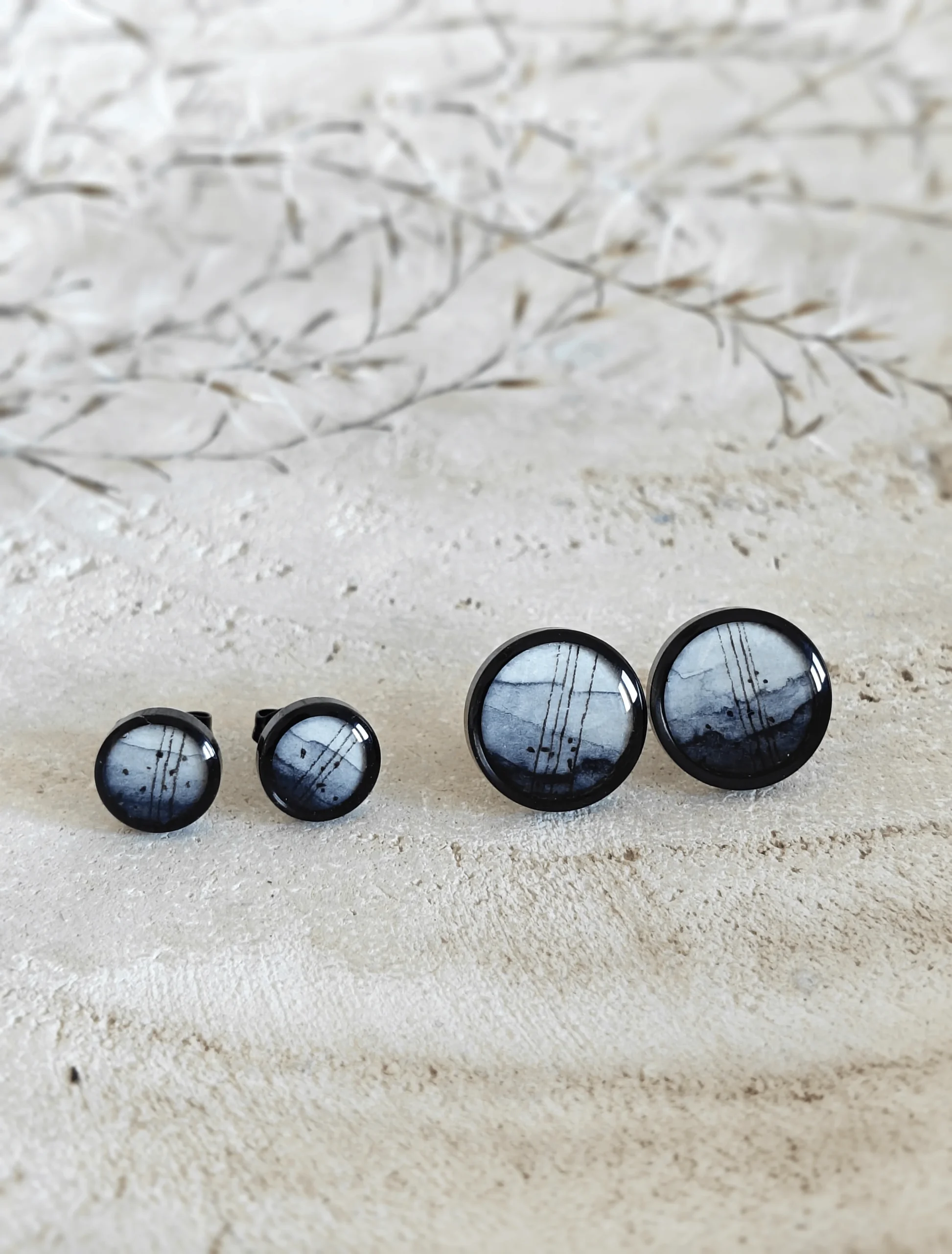 Czarne kolczyki z ręcznie malowaną akwarelą to mini obraz zalany żywicą w monochromatycznych, czarno-białych barwach. Klasyka broni się sama. Te minimalistyczne kolczyki są tak różnorodne w formie, że mimo swoich niewielkich rozmiarów robią ogromne wrażenie. Cały zestaw tej biżuterii wraz z czarnym naszyjniem, bransoletką i pierścionkiem znajdziesz w zakładce komplety. Kolczyki możesz zakupić u nas w 3 rozmiarach (6, 8, 10 mm).