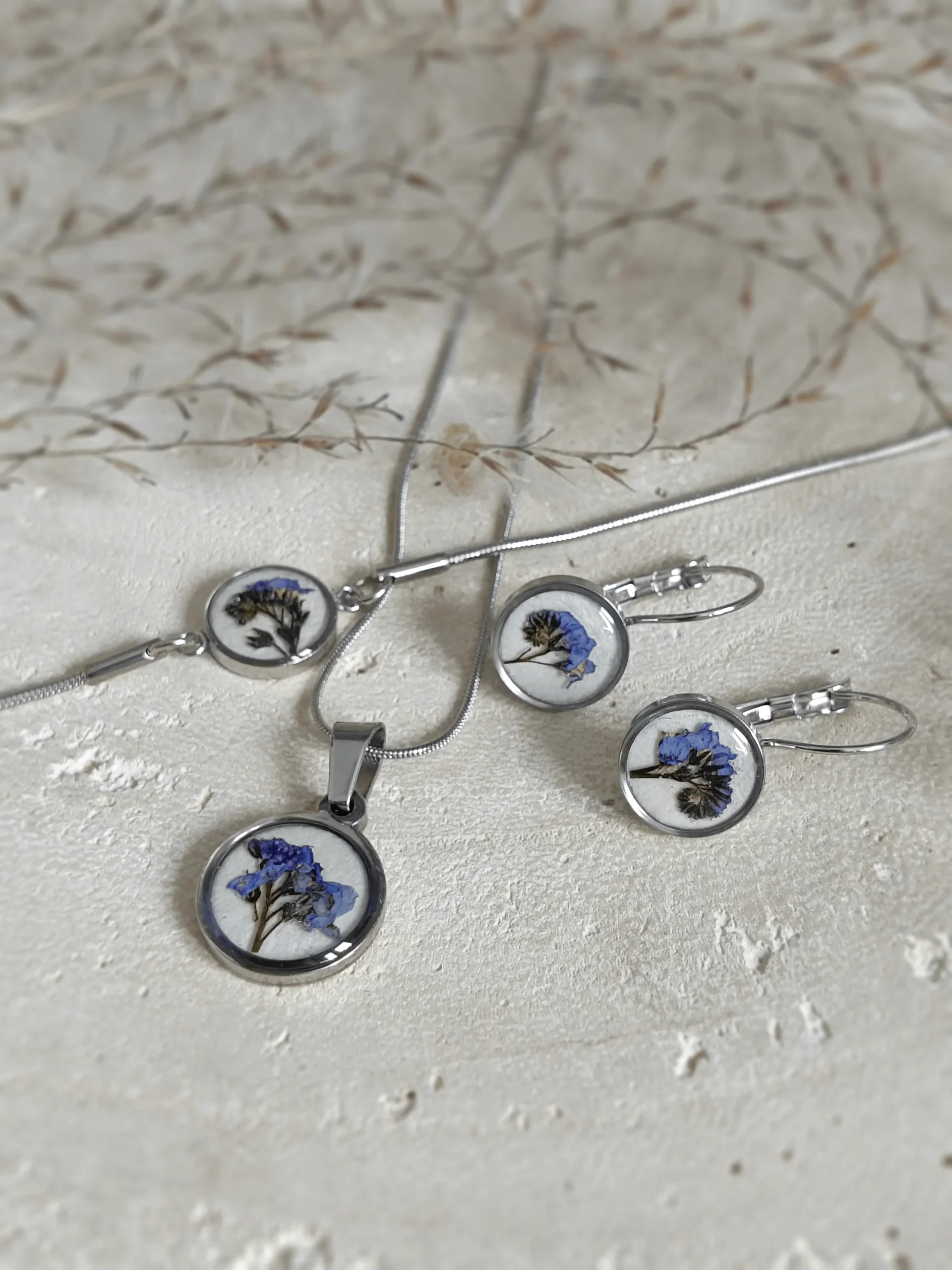 Nie ma chyba bardziej sentymentalnej biżuterii niż komplet biżuterii botanicznej z prawdziwą niezapominajką. Ten uroczy niewielki kwiatek przynosi same pozytywne skojarzenia. Nazywa się go kwiatem pamięci i wierności. Legenda głosi, że pewien rycerz zbierał kwiaty na brzegu rzeki dla swojej ukochanej. Kiedy schylił się po ostatni kwiat, został porwany przez prąd. Ostatnie słowa, które wypowiedział do swojej dziewczyny, brzmiały: „Nie zapomnij mnie!”. Od tamtej pory kwiat ten nosi nazwę niezapominajka. Według słowiańskich wierzeń, niezapominajka była oczami boga Swaroga, które spadły na ziemię. Dlatego też kwiat ten ma małe, niebieskie płatki przypominające oczy. Taka delikatna biżuteria będzie świetnym pomysłem na prezent dla ukochanej osoby.