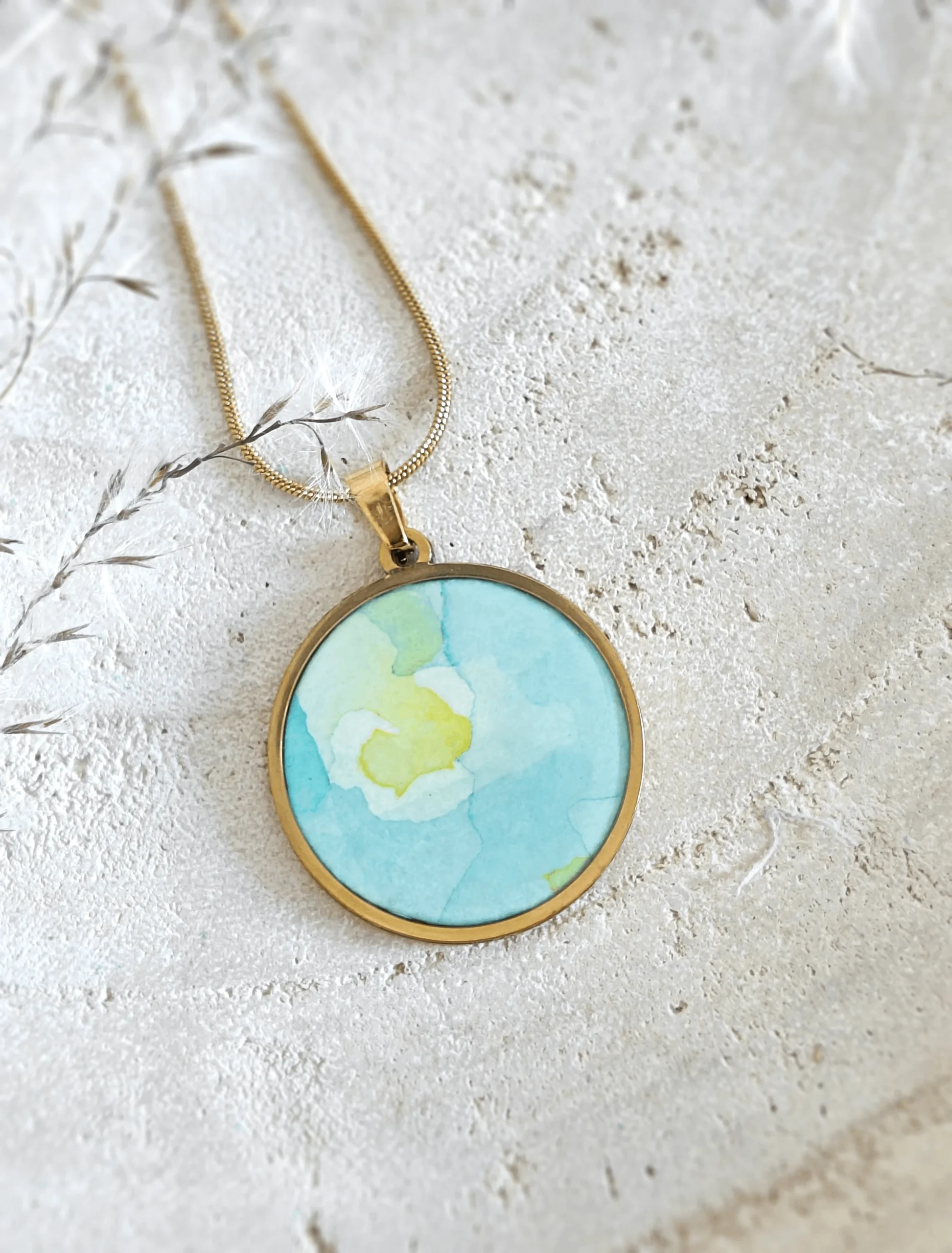 Naszyjnik z kolekcji Aktis, to niezwykle urokliwa zawieszka. Malowana ręcznie akwarelami w kolorze błękitu nieba z drobną żółtą plamką nawiązującą do promieni słońca (stąd nazwa Aktis -promień). Łańcuszek i zawieszka ze stali chirurgicznej sprawiają, że naszyjnik jest odporny na działanie czynników zewnętrznych. Te subtelne pastelowe kolory doskonale łączą się z każdym pastelowym odcieniem, będą pasować również do intensywnego granatu, różu, bieli oraz czerni. Naszyjnik założysz do wielu stylizacji. Jest to również doskonały na naszyjnik na prezent, symbolizyjący witalność, energię nawiązujący do promieni słońca, świetny podarunek dla Twojego „Słoneczka”. W zakładce komplety zakupisz bransoletkę, pierścionek czy kolczyki do zestawu. Naszą biżuterię malujemy najwyższej jakości japońskimi farbami akwarelowymi, które są wykonane z naturalnych składników.