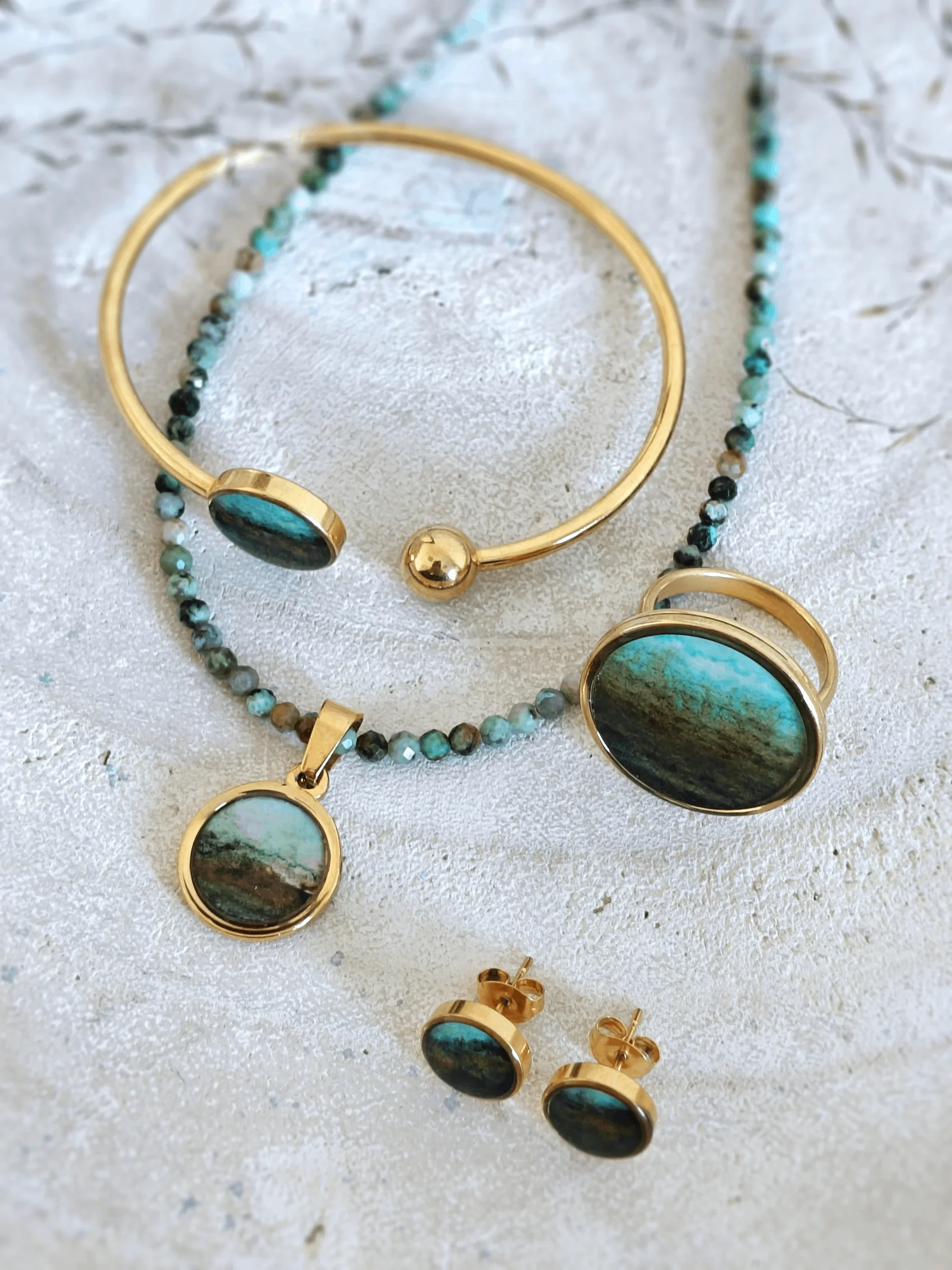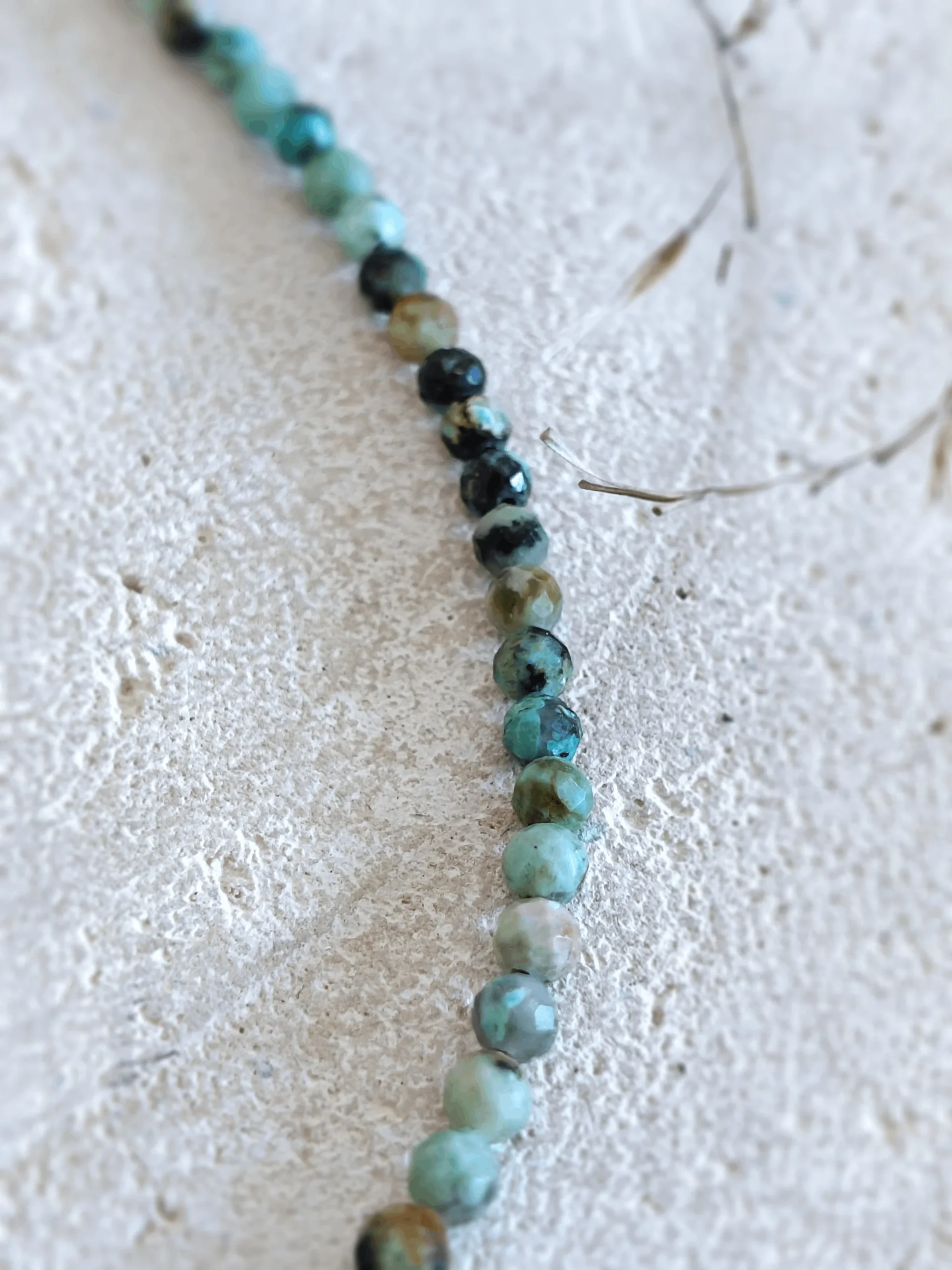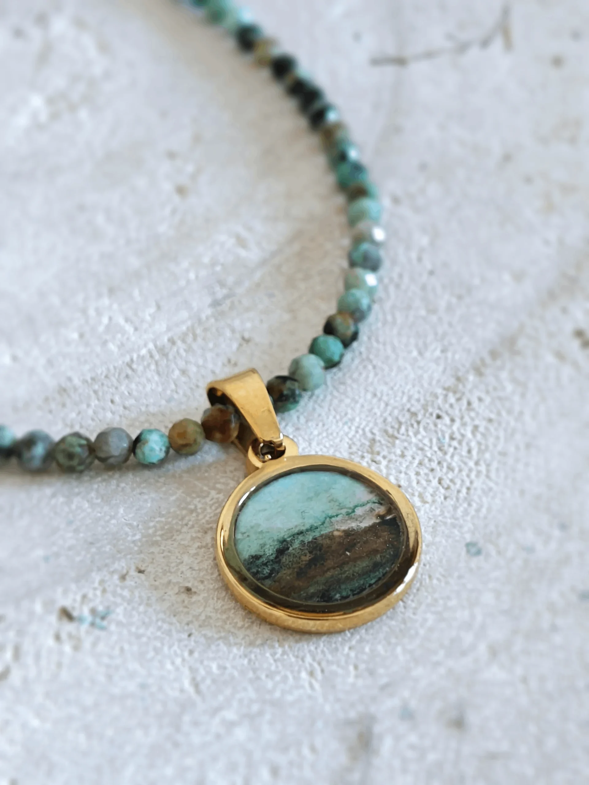 Centralnym elementem naszyjnika jest turkus afrykański. Ten wyjątkowy minerał, o charakterystycznym zielonkawo-niebieskim odcieniu z brązowymi żyłkami, od wieków ceniony jest za swoje właściwości. Wierzy się, że chroni przed negatywną energią, uważany jest za kamień ochronny, który odpędza złą energię i chroni przed nieszczęściami. Wzmacnia intuicję i mądrość, pomaga w podejmowaniu decyzji, wzmacnia intuicję i dodaje mądrości. Przynosi szczęście i pomyślność, uważany jest za talizman szczęścia, który przyciąga pomyślność i dobrobyt. Wspiera komunikację i wyrażanie siebie, pomaga w otwartej i szczerej komunikacji. Symbolizuje przyjaźń i lojalność, jest symbolem trwałych relacji i wierności.