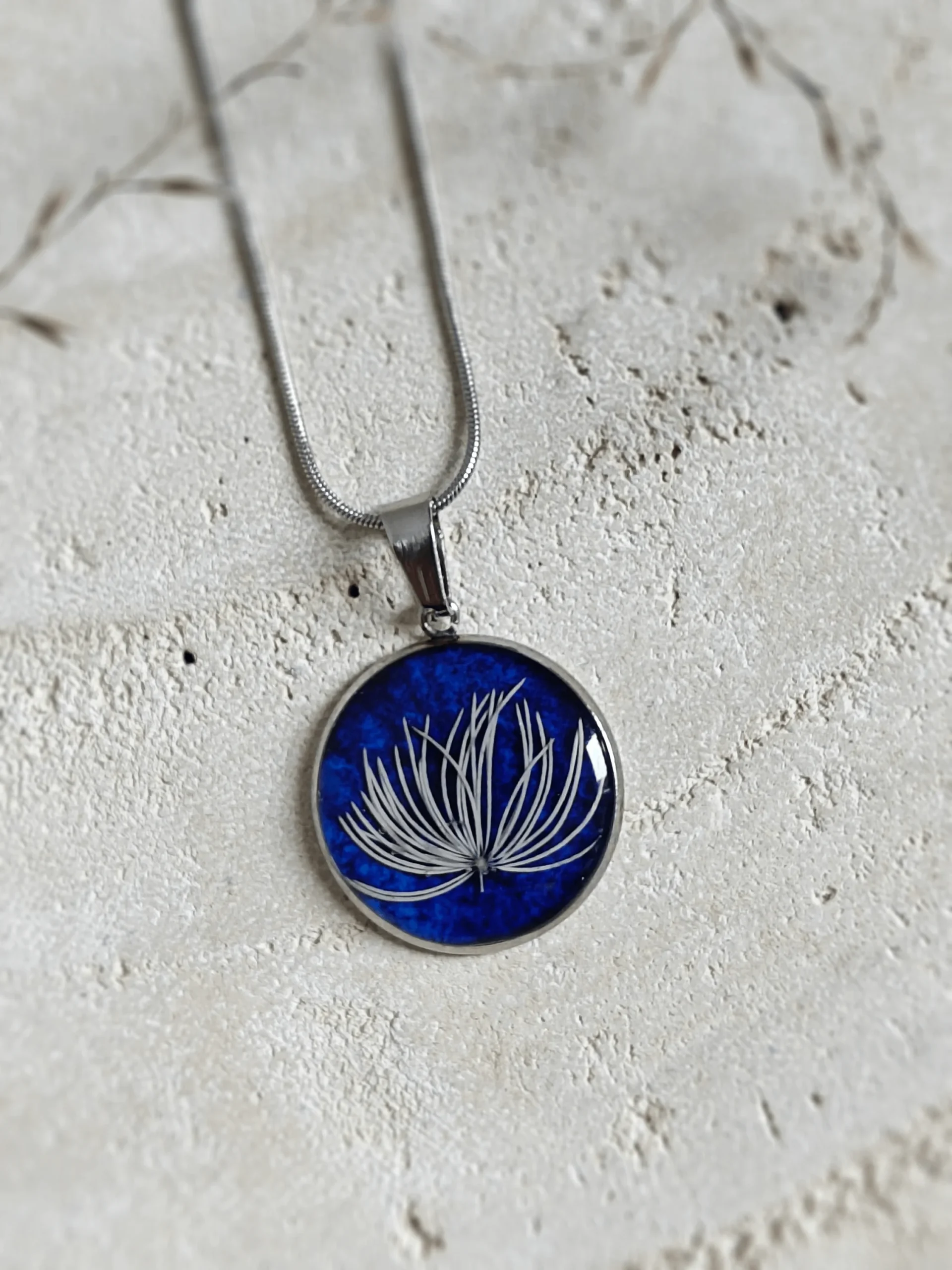 Odkryj subtelne piękno natury z naszyjnikiem z kolekcji Ventus. W tym wyjątkowym projekcie delikatna biała trawa została zatopiona na tle głębokiego, granatowego odcienia, tworząc miniaturowe dzieło sztuki. Granatowa akwarela, nakładana ręcznie z dbałością o każdy detal, przypomina bezkresne nocne niebo, na którym lśni subtelna biel trawy. Każdy naszyjnik jest niepowtarzalny, dzięki unikalnemu układowi źdźbeł trawy i niuansom barw akwareli. Do stworzenia tła użyto najwyższej jakości japońskich farb akwarelowych z naturalnymi pigmentami, co gwarantuje trwałość i głębię koloru.
