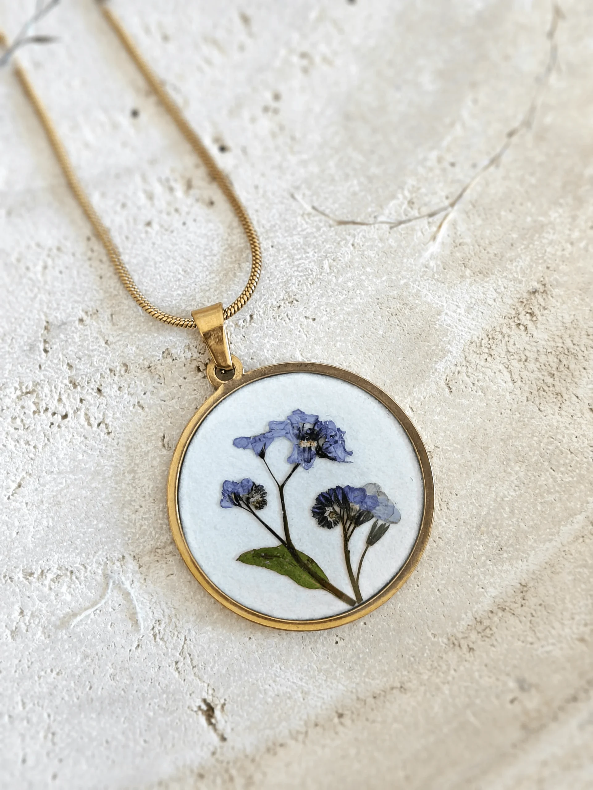 Niezapominajki niosą za sobą wiele symboliki. Zatopione w bizuterii są wyjątkowym prezentem dla kogoś bliskiego. Naszyjnik z niezapominajką może uhonorować ważną uroczystość, ale także noszony na codzień będzie „przypominajką” o czymś lub o kimś ważnym. Ten handmade naszyjnik powstaje w największym zaangażowaniu: niezapominajki są zbierane w pobliskim lesie i suszone między książkami, następnie układane igiełką w oczku naszyjnika. Dziękujemy, że wybierasz poslkie rzemiosło i wysoką jakość, nasz naszyjnik będzie Ci służył przez długie lata. Jeśli chcesz zakupić kolczyki, czy bransoletkę do zestawu sprawdź zakładkę komplety. Naszyjnik może przygotować dla Ciebie w oprawie złotej lub srebrnej.