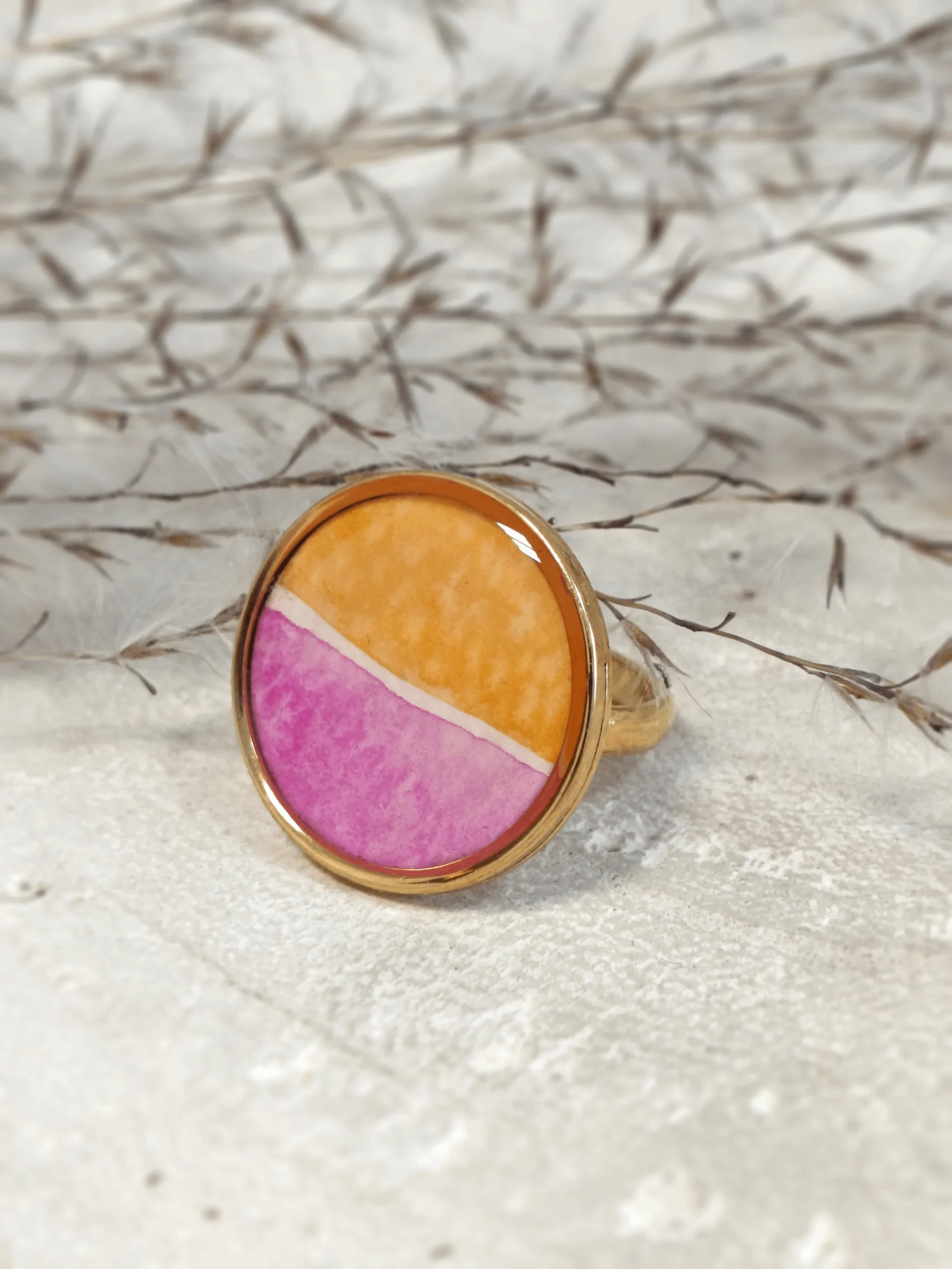 Pierścionek z kolekcji Fresco to najmodniejsze w ostatnim sezonie połączenie różu i pomarańczu. Pierścionek jest ręcznie malowany akwarelami i zalany żywicą. Regulacja rozmiaru sprawia, że zapewnia on komfort noszenia. Ten pierścionek damski jest delikatny i doskonale sprawdzi się i jako subtelny dodatek do sukienek lub minimalistyczny pierścionek do codziennych stylizacji.