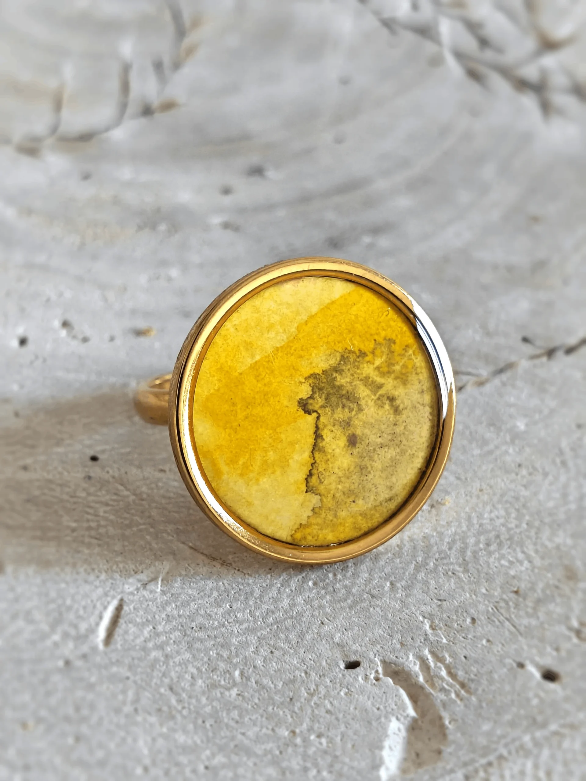 Pierścionek Apis to niezwykle efektowny pierścień malowany ręcznie akwarelami z dominującym kolorem żółtym. Połączenie elegancji i trwałości. Akwarelowy pierścionek z żywicy jest odporny na zarysowania i przebarwienia, a dzięki ręcznemu i starannemu wykończeniu prezentuje się niezwykle stylowo.Kolekcja Apis nawiązuje do kamienia Jaspis Trzmiel, stąd cała kolorystyka kompletu.. Ten duzy pierścień jest niezwykle efektowny, a komfort noszenia zapewnia regulacja pierścionka. Całą kolekcje z jaspisem znajdziesz w zakładce komplety, gdzie przy zakupie naszyjnika, kolczyków i bransoletki możesz skorzystać z atrakcyjnej oferty.