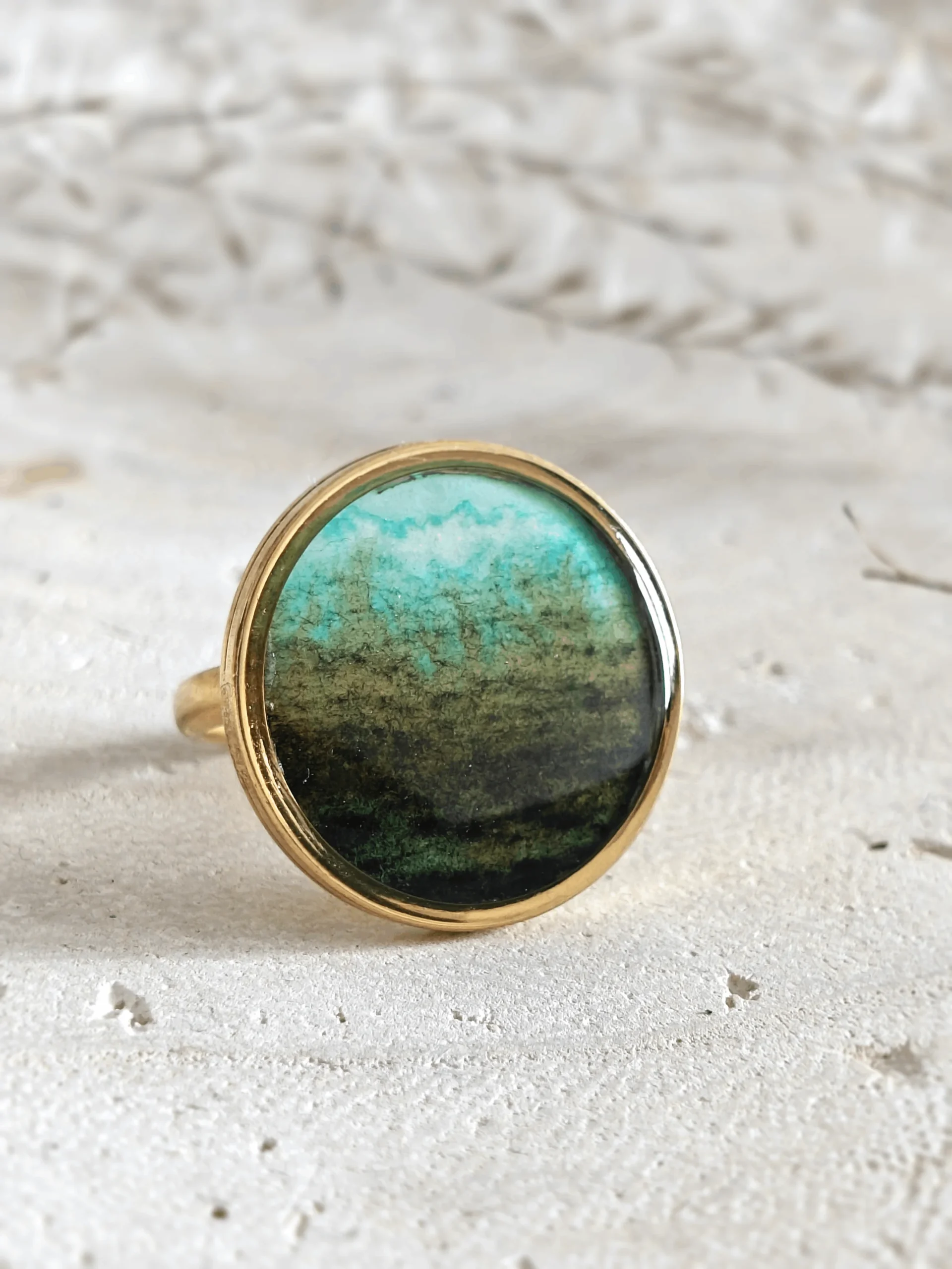 Pierścionek z kolekcj Ubuntu to przepiękny, delikatny, ręcznie malowany akwarelami pierścionek. Nie ma takiego drugiego. Subtelne połączenie turkusu z brązem, w głębokiej barwie akwareli sprawia, że jest to bardzo delikatny pierścionek damski. Jest na tyle uniwersalny, że założysz go zarówno na wyjątkowe okazje jak i na codzień. Kolekcja Ubuntu zaskoczy Cię połączeniem turkusu afrykańskiego z akwarelami. Cały zestaw z naszyjnikiem z minerałów oraz kolczykami i bransoletką możesz zakupić w zakładce komplety.