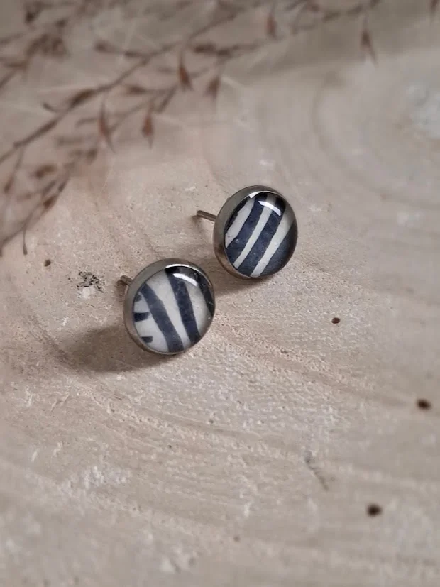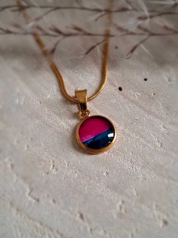 Jedyny w swoim rodzaju komplet biżuterii malowanej akwarelami. Ciemna zieleń z bladoróżowymi akcentami – połączenie nietypowe, jednak grające idealnie i przywodzące na myśl kolory znajdowane na korze drzew. Komplet dostępny w złotej oprawie składa się z kolczyków sztyftów o średnicy 8mm oraz naszyjnika.